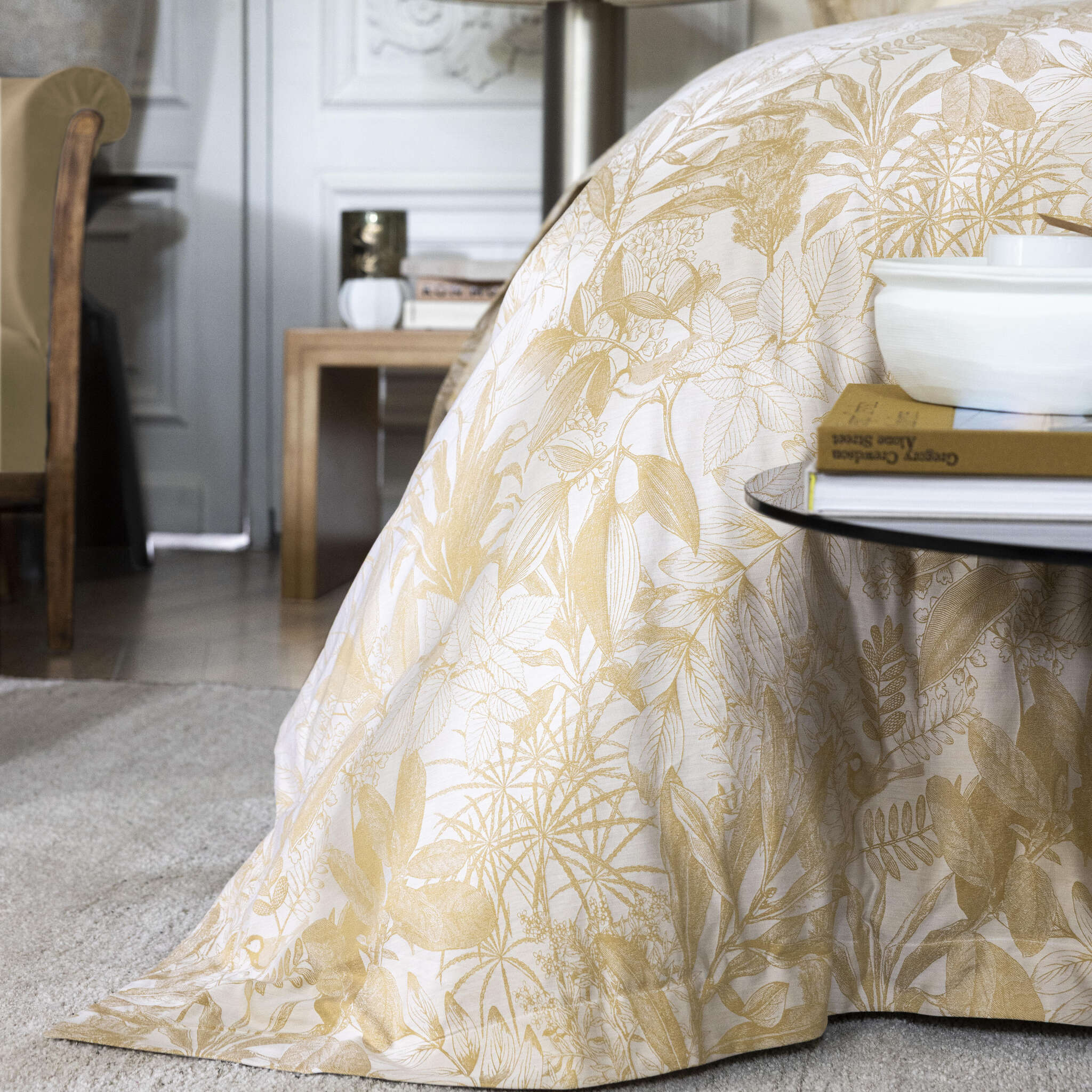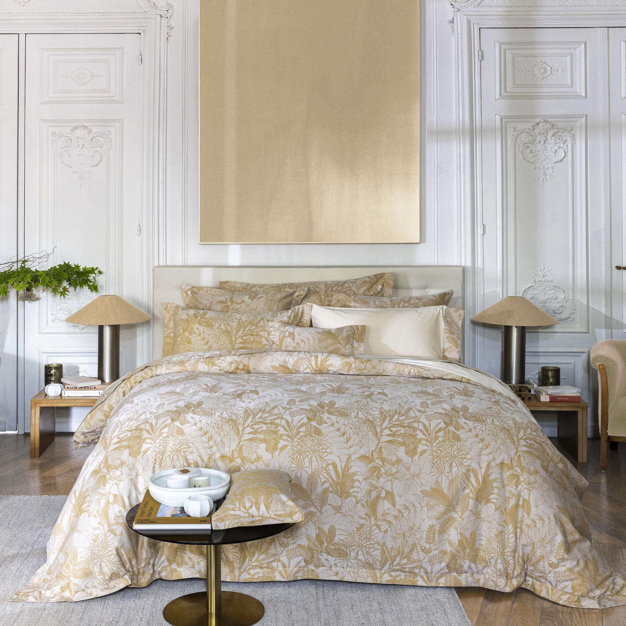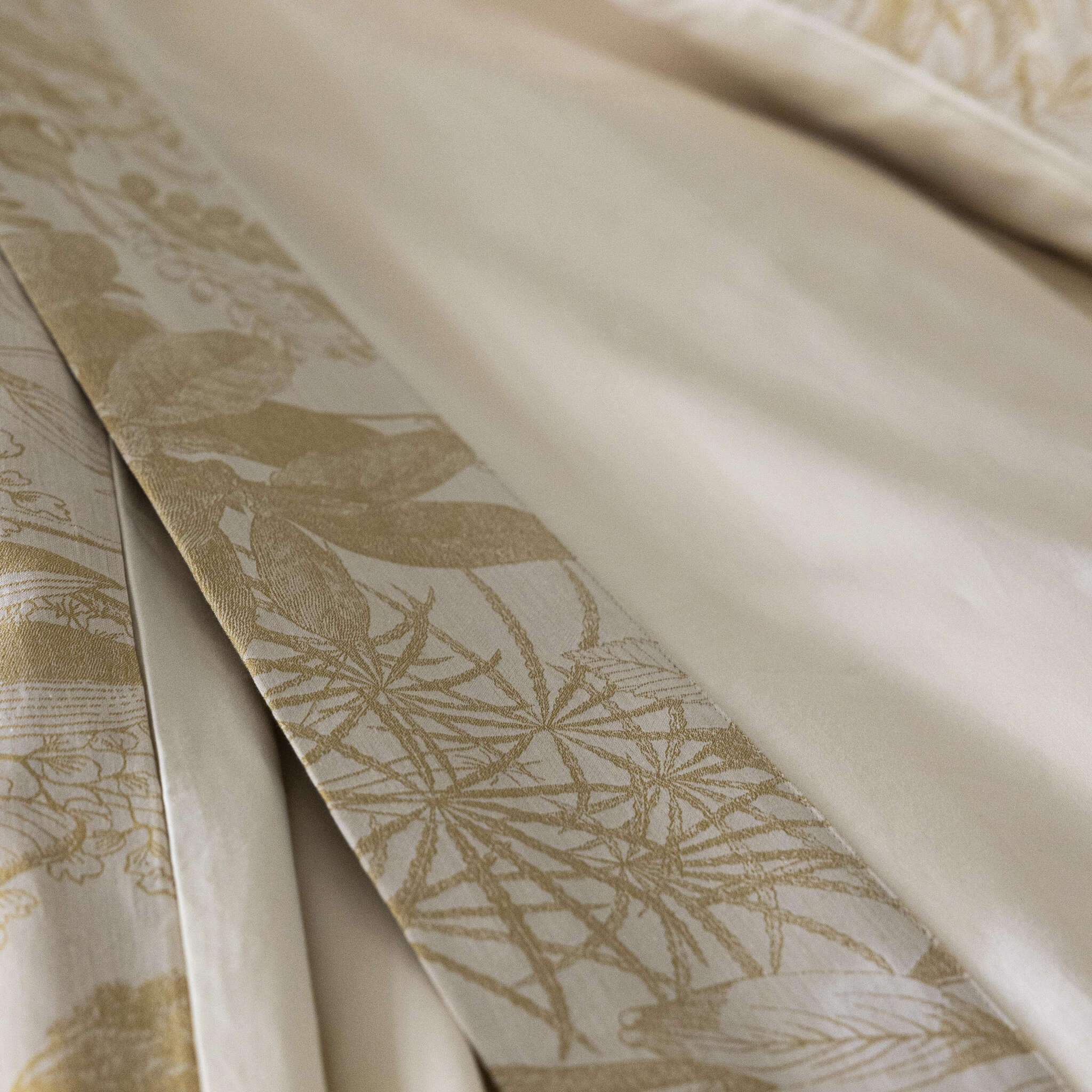 A silky bed set enhanced by light, like a cocoon of softness in a majestic bedroom. In the heart of the forest, leaves of many kinds intertwine, gently welcoming graceful chickadees. The ivory jacquard, highlighted with luminous ochre, reveals the full finesse of the design and the richness of the fabric. A refined creation, conceived as a moment of elegance and nature.