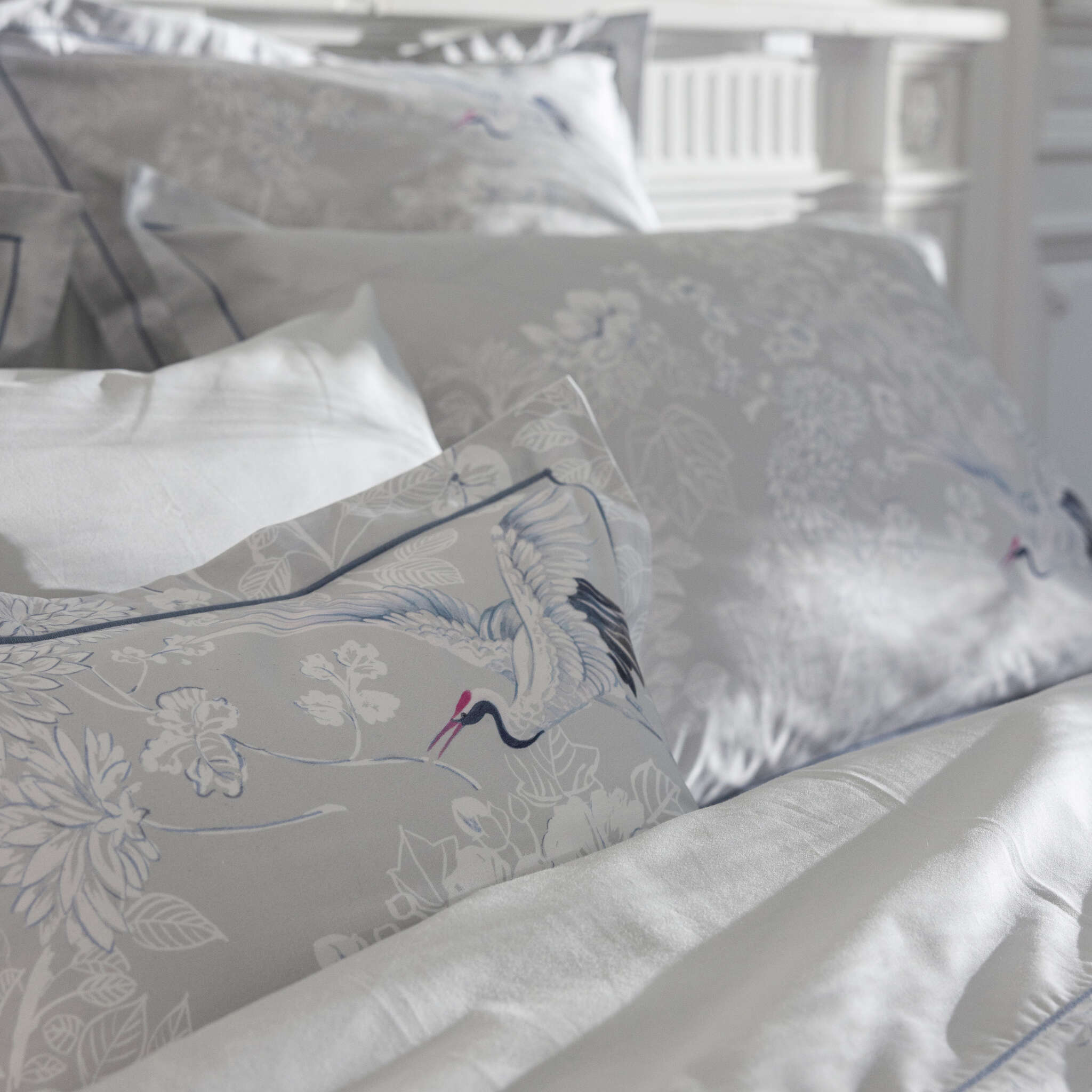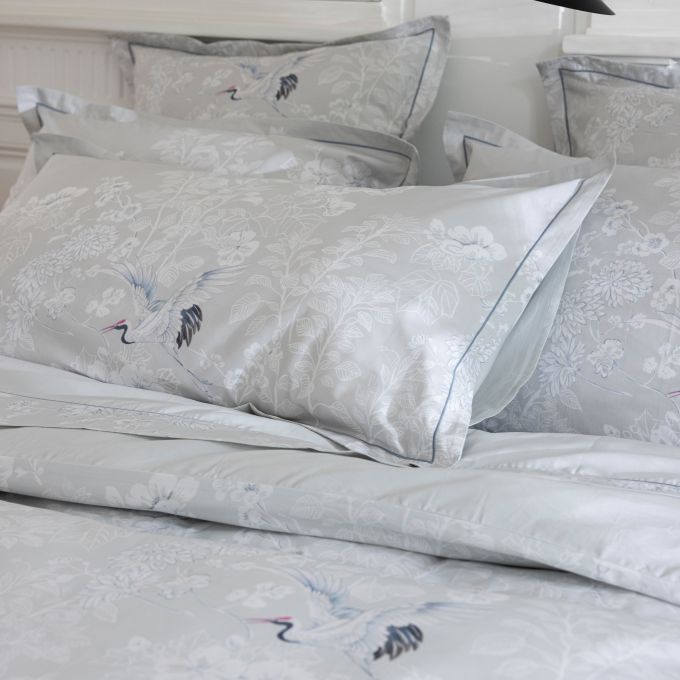 This bedding set immerses you in the tranquility of a Japanese garden, where nature reveals itself in delicate lace, inspired by the dance of herons in the wind.