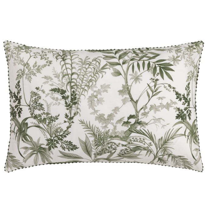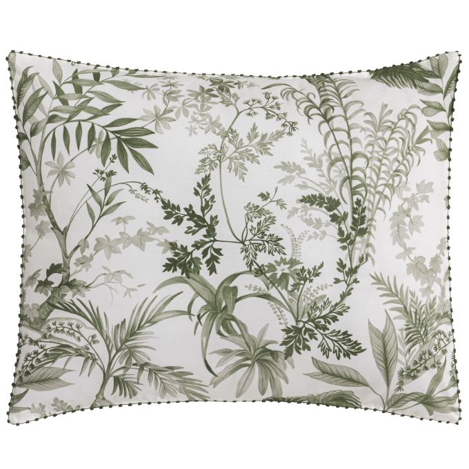 Somewhere in Europe, where the sky is a deep blue, this duvet cover is a life-size journey to the heart of a lush garden. Inspired by panoramic paintings, ivy, capillary, calathea, hosta and many other species harmonise to create a garden paradise. The matching pillowcases are highlighted with a delicate braid.