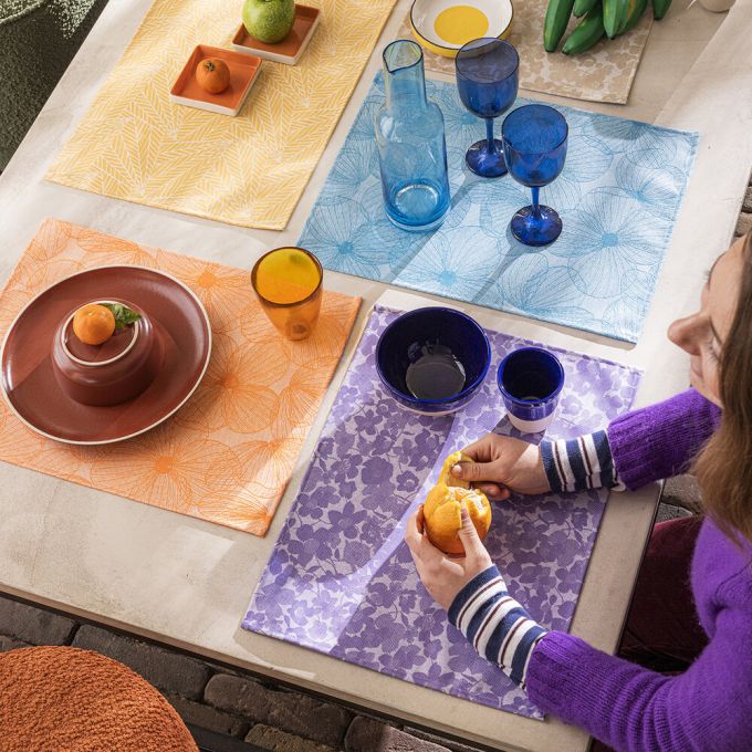 À la carte, it's you who chooses! A zesty, neutral, and timeless collection in recycled threads that will bring essential twists and mix-and-match for a joyful and eco-responsible table. Flowers, butterflies, and mineral graphics set your table in complete harmony. Sometimes intense, sometimes pastel... Vibrant colors are unleashed and embraced with this new collection of coated sets.