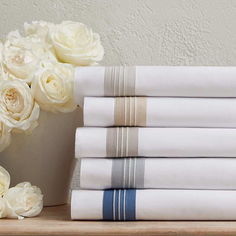 Tailored, with three Natural White embroidered rows on a two inch Ginerva border, our Hudson design offers a combination of modern and traditional. Choose from 14 border color options on our long-staple cotton sheeting in White, Antique White or Ivory.