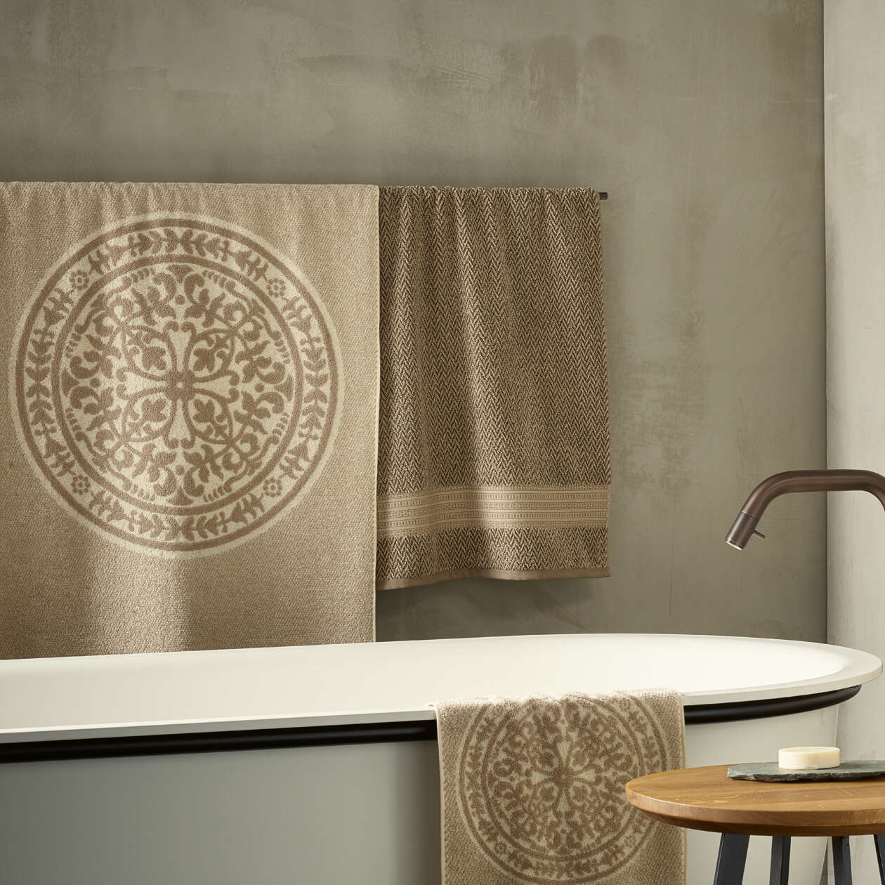 The Terry Medici range of hand towels delights with its historical arabesque. The special quality terry fabric product is made from a blend of linen and cotton.