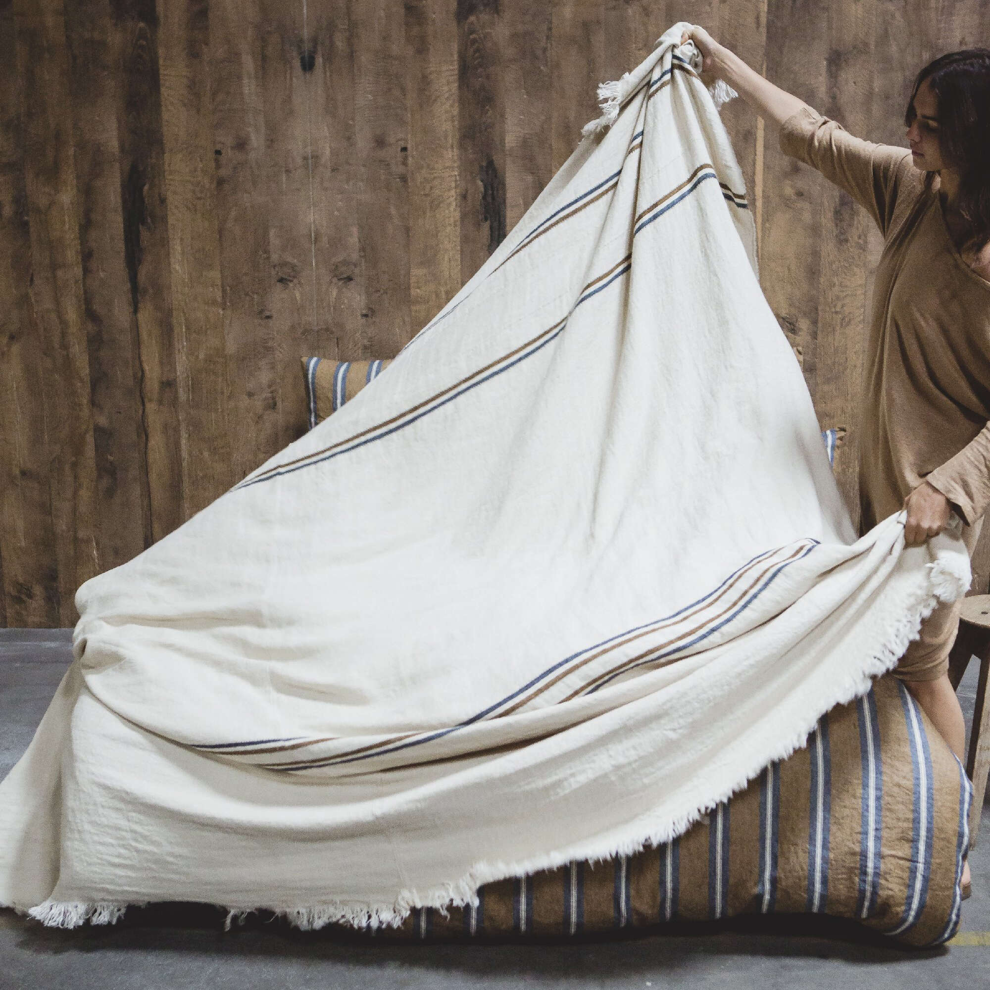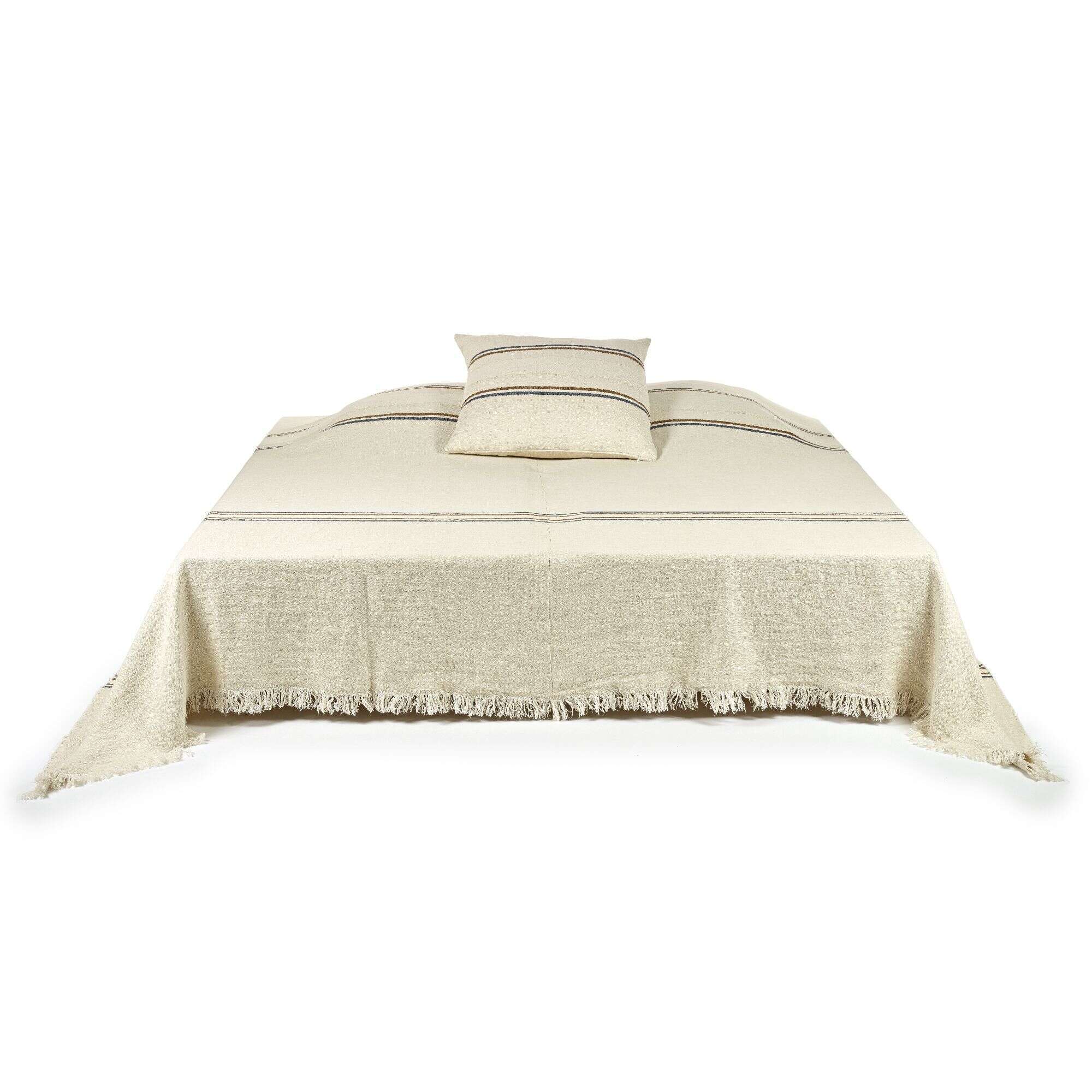 After many, many requests, we finally have a new coverlet! It is inspired by The Belgian Towels; similar construction, but slightly heavier. The coverlet is seamed down the center, and fringed at the top and bottom, the sides are not hemmed but finished with the selvage. The design is simple, navy and bronze stripes sitting on an ecru ground.