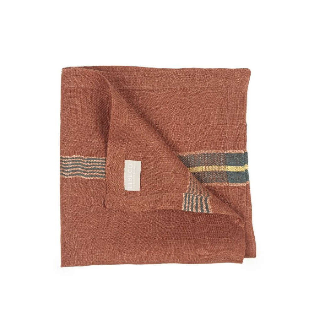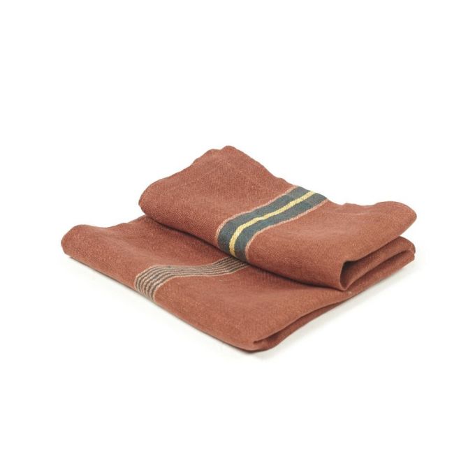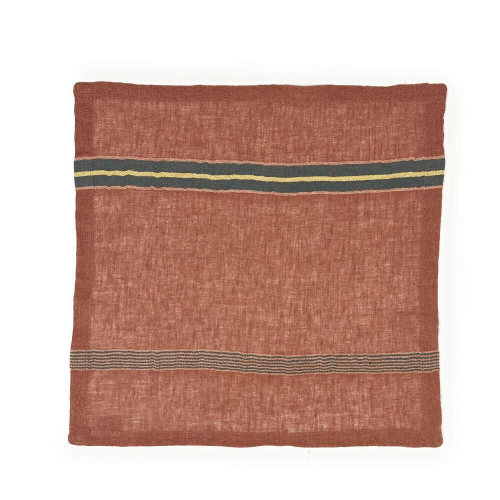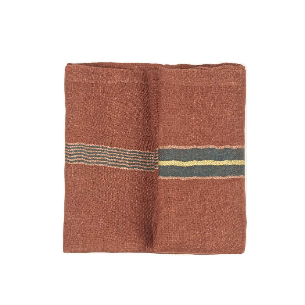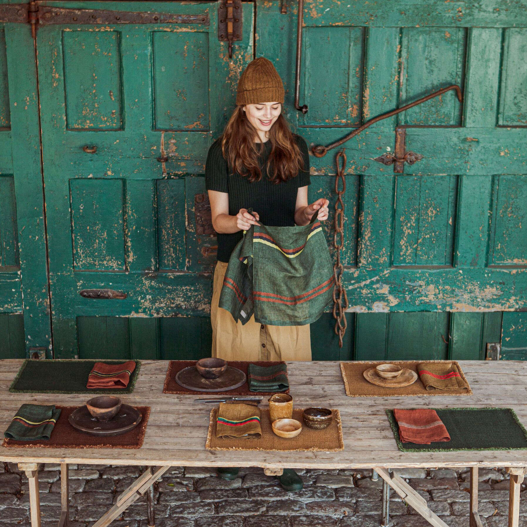 Our classic open weave napkin construction is back in lots of colours and combinations! Banff carries stripes in evergreen, mustard, and old rose on a mahogany-coloured ground.