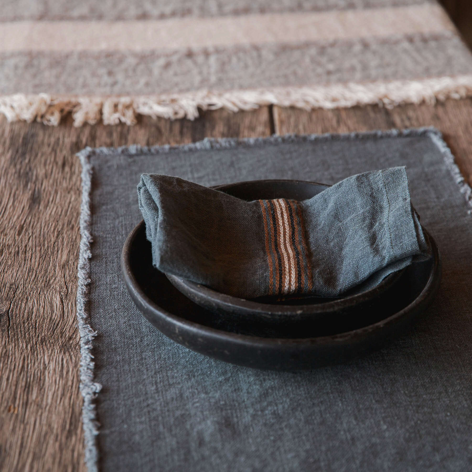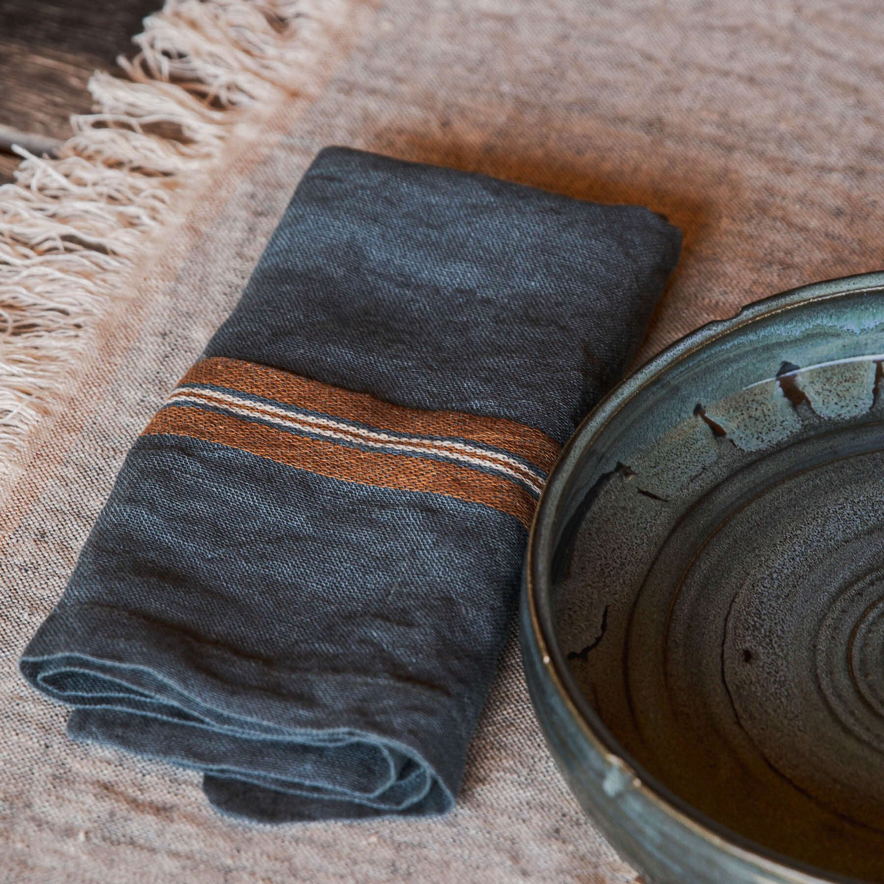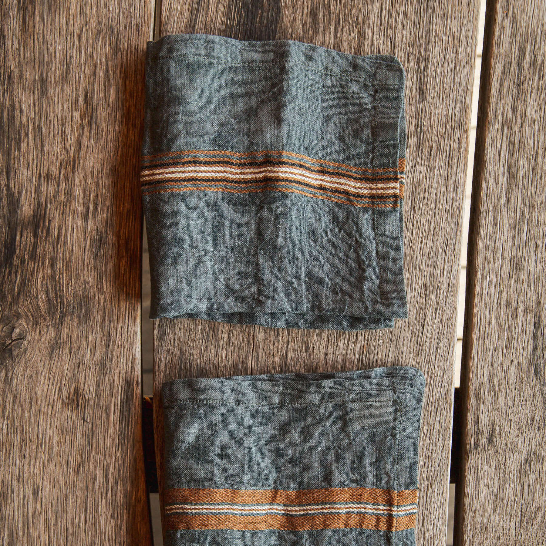 This napkin has two different stripes sitting on the river colored ground.