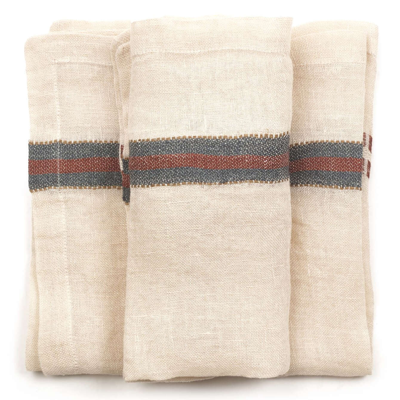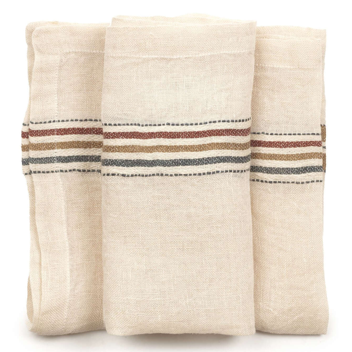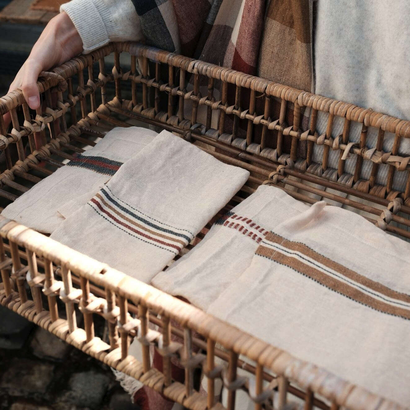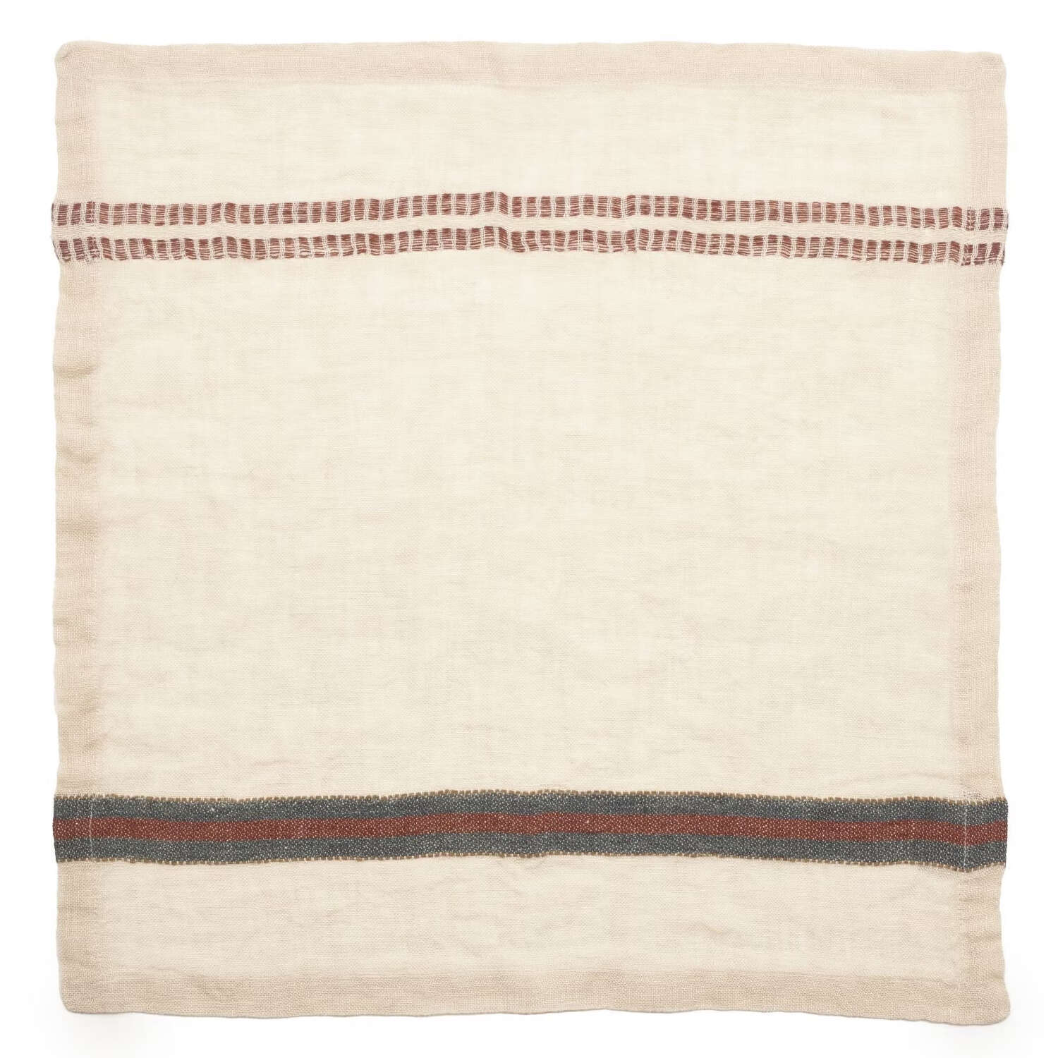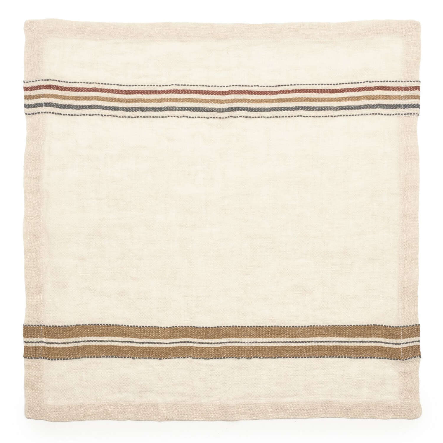 It features our classic LH open weave quality in a dusty off-white color, accented with various stripes in warm oak, rusty brown, and gray blue.