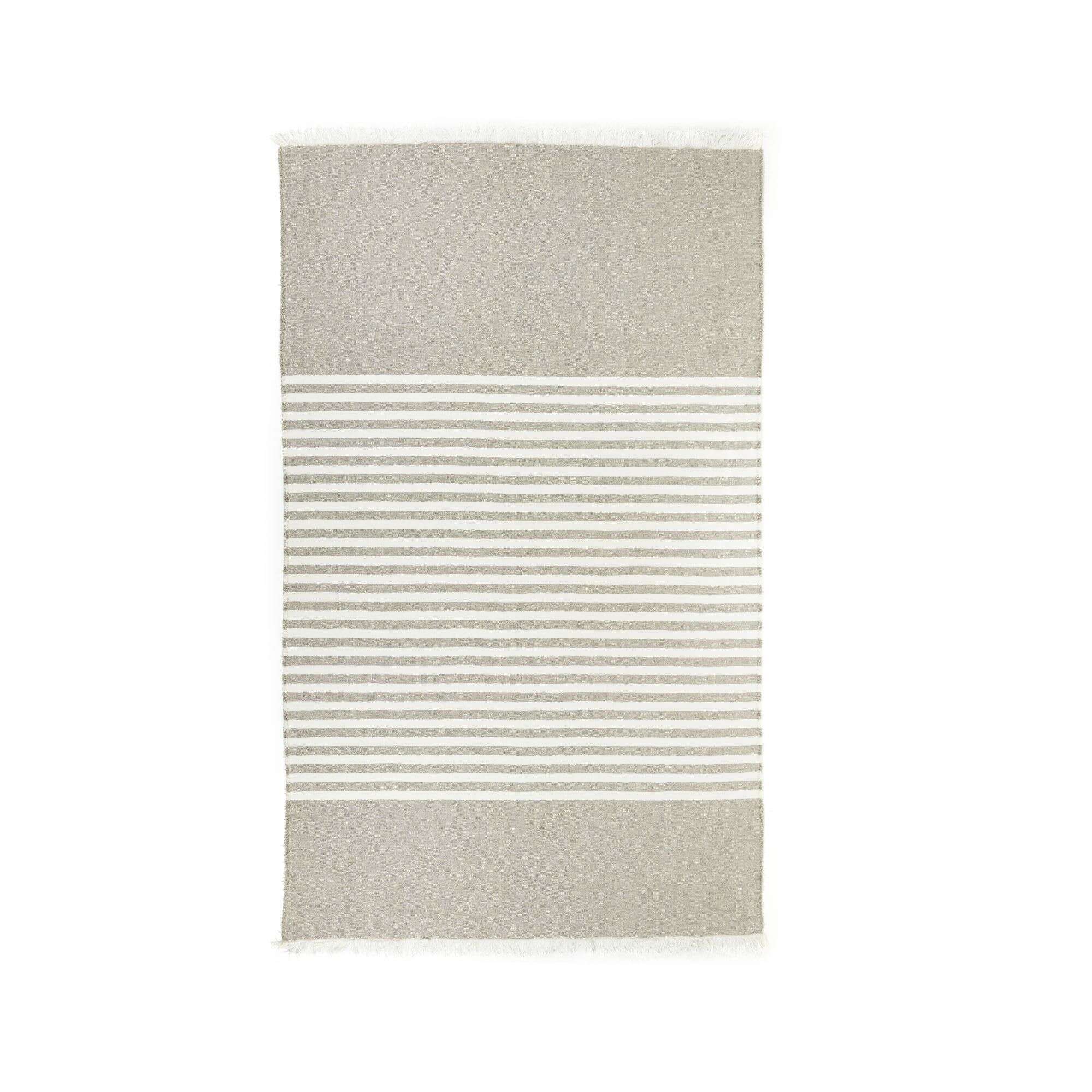 Camille has clear, crisp lines and a slubby, textured fabric. The design is a grey/flax base with 1-inch oyster stripes.