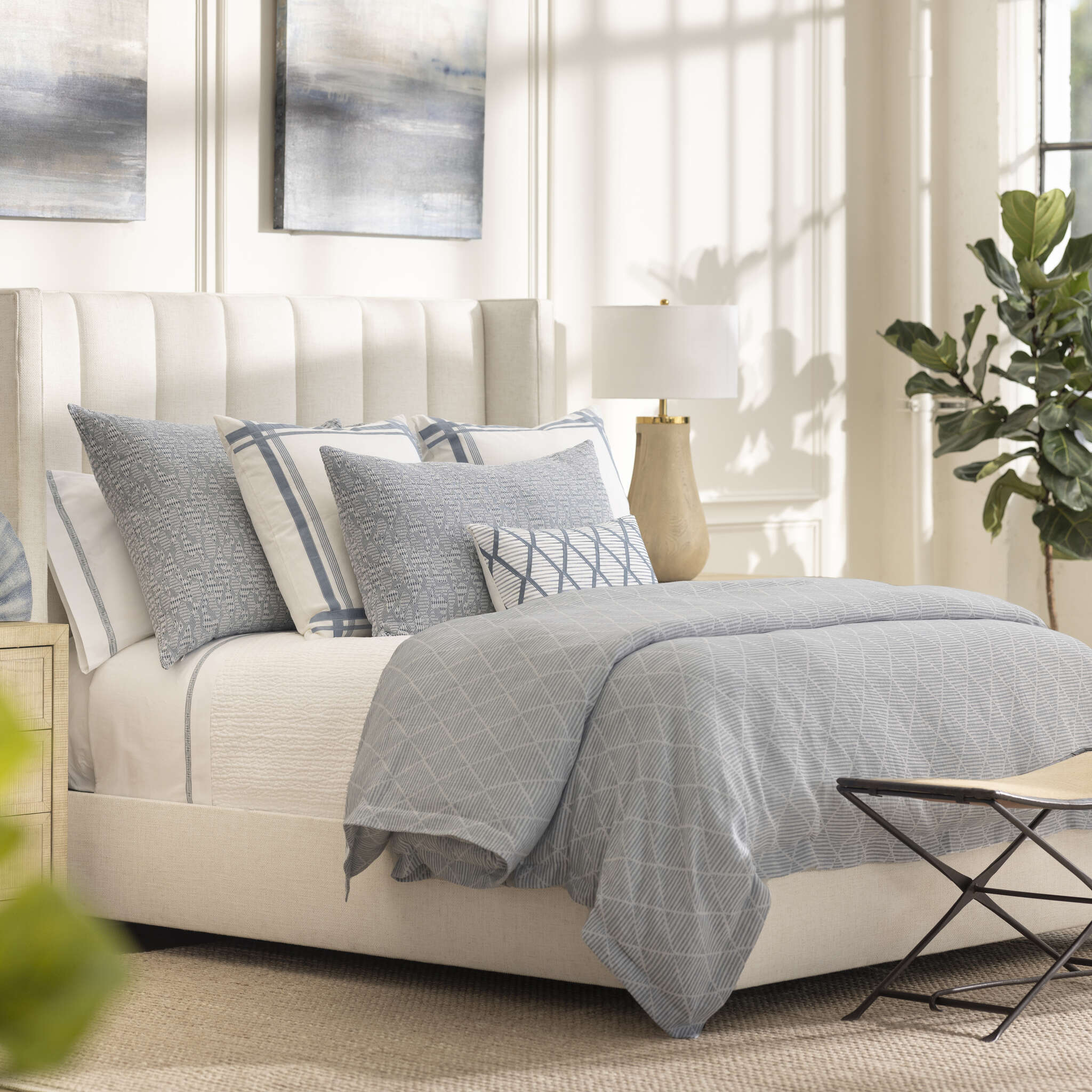 The Brook is made with Blue and White Cotton Linen Jacquard.