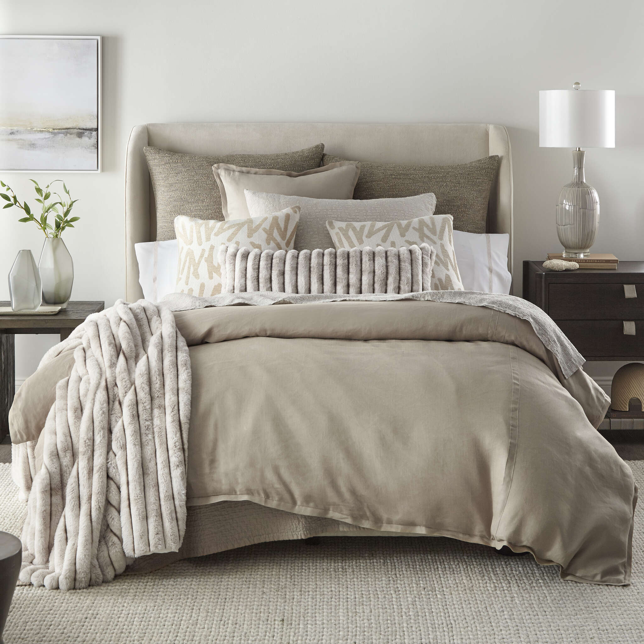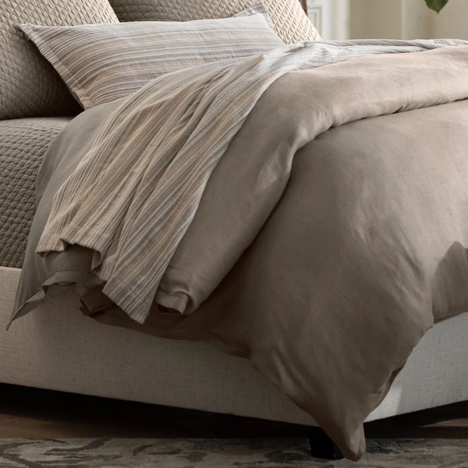 Machine launder in cold water on a gentle cycle, and use a cold water rinse. Use a mild detergent, avoid bleach, softeners, and dryer sheets. Tumble dry on low heat and remove promptly to prevent wrinkling. We recommend washing larger pieces such as coverlets, blankets, and duvets separately.