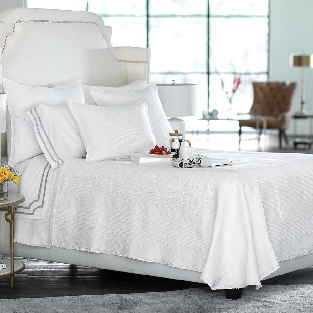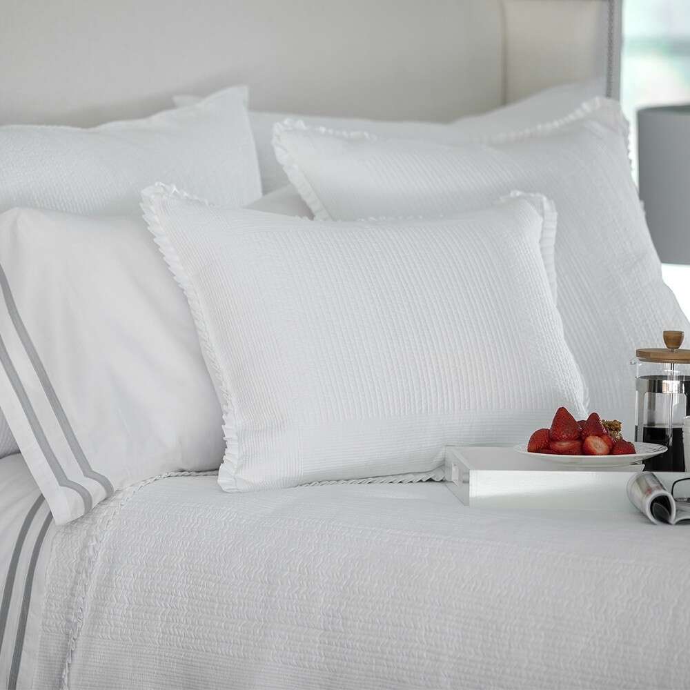The luxury white cotton sateen coverlets and designer pillows in this Battersea collection offer a clean, elegant simplicity to any bedroom. Each piece of Lili Alessandra Battersea white cotton sateen bedding is channel quilted with a ruffled flange, and all pillows in the collection include complimentary inserts with purchase. Use this white cotton sateen bedding as the foundation of your more colorful, eye-catching pieces, or leave the bed stripped down to its basic, clean, white elements. However you decide to incorporate the Battersea white cotton sateen pillows and coverlets into your space, we’re sure you’ll love their rustic simplicity.