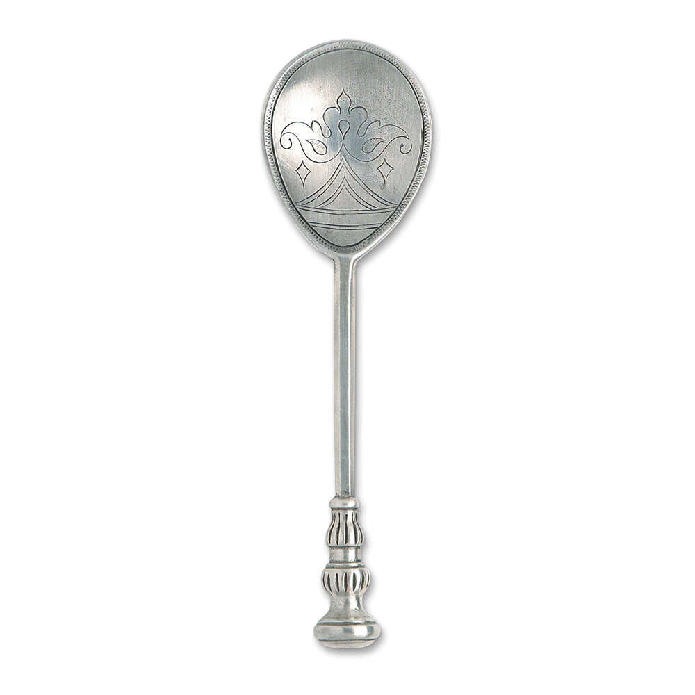 Featuring a charming filigree engraving, this one of a kind all-pewter spoon is perfect for adding an artful flair to serving side dishes, condiments, and sauces.