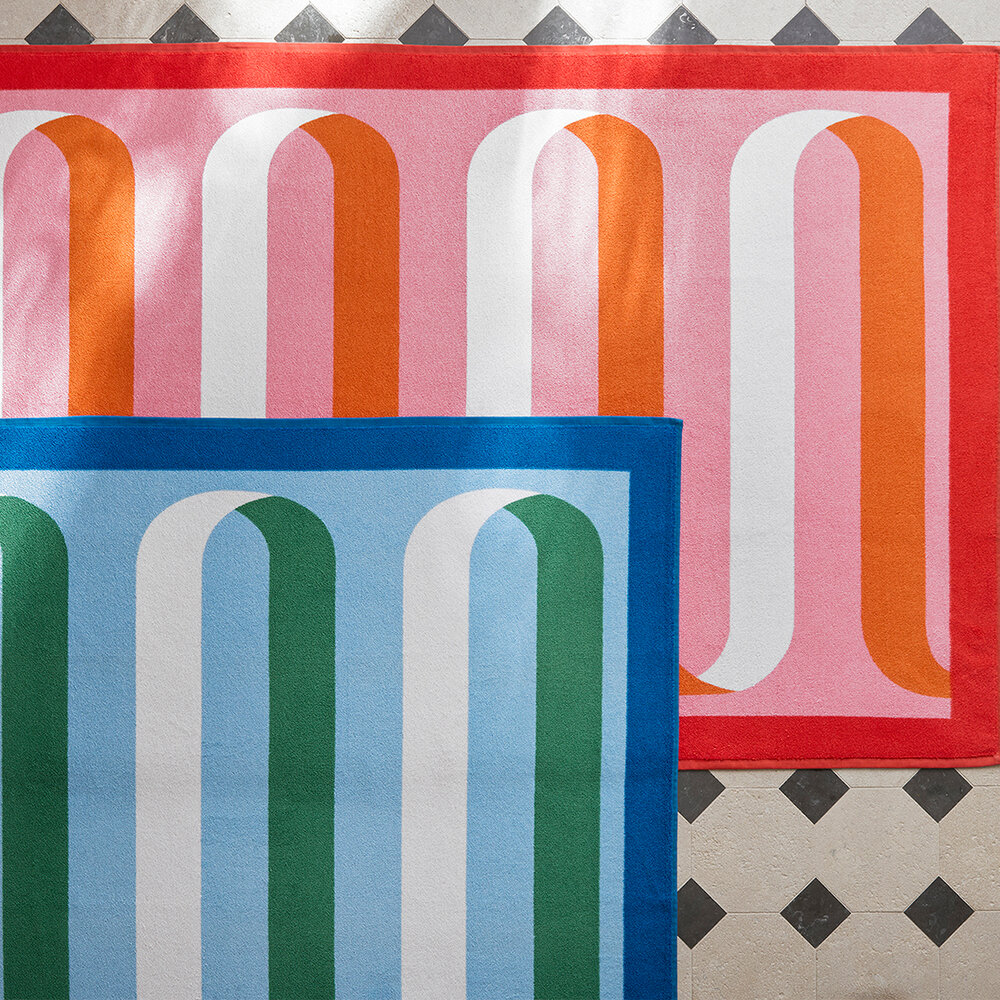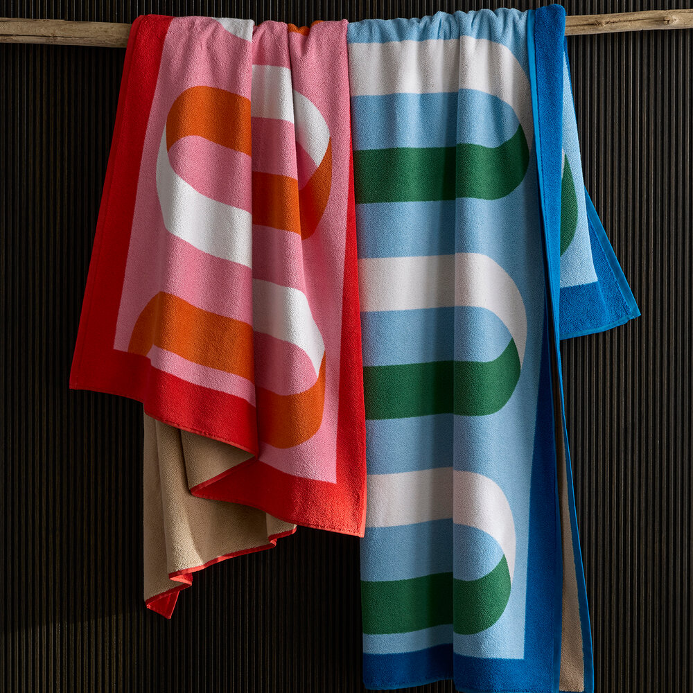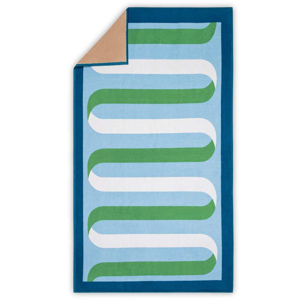 Ribbon brings a refined graphic touch to the beach or pool. A Matouk Schumacher design, it features a flowing ribbon motif inspired by a Schumacher tape, with a soft reverse in a neutral sand color for understated contrast. Woven in Portugal from soft cotton terry, it's a colorful new classic.