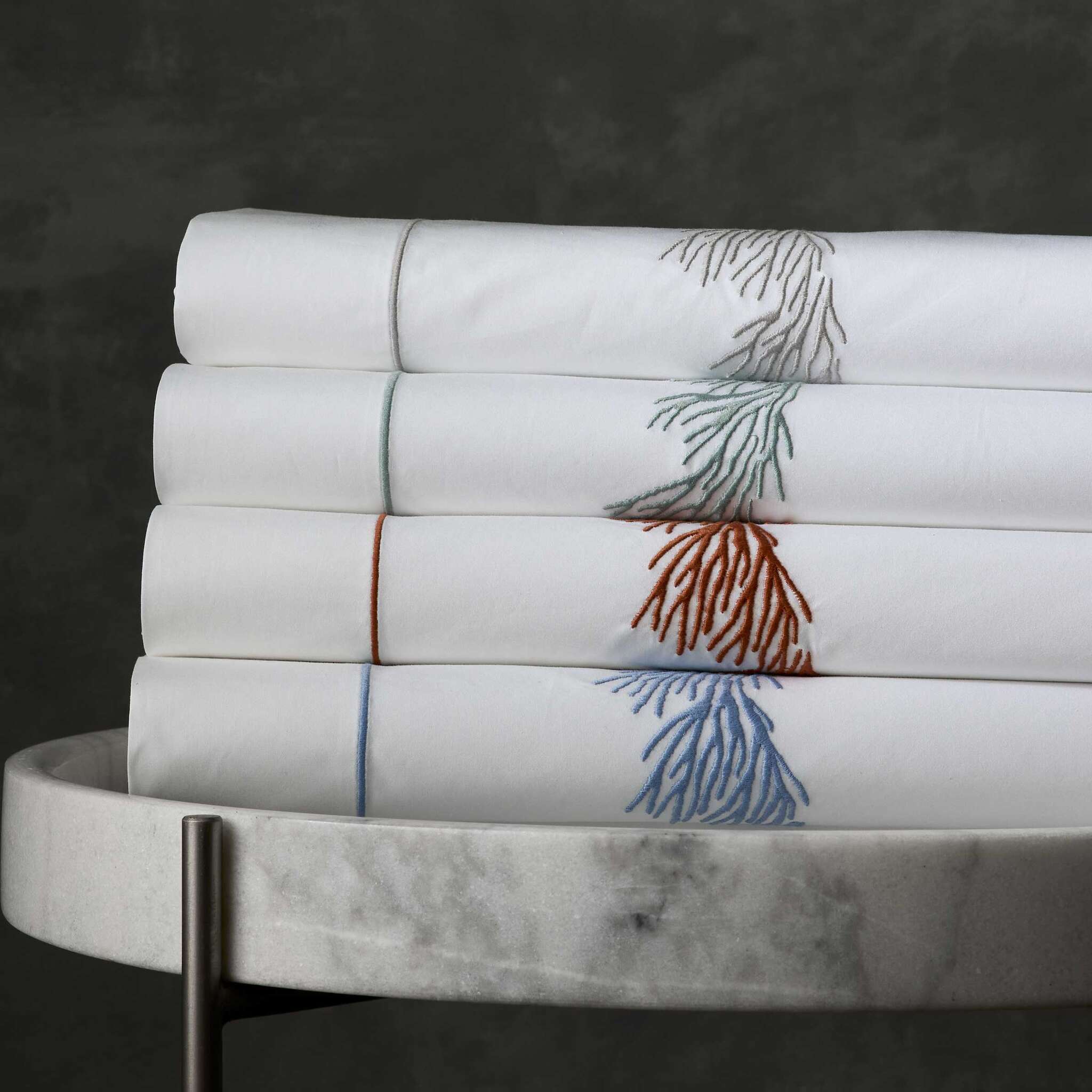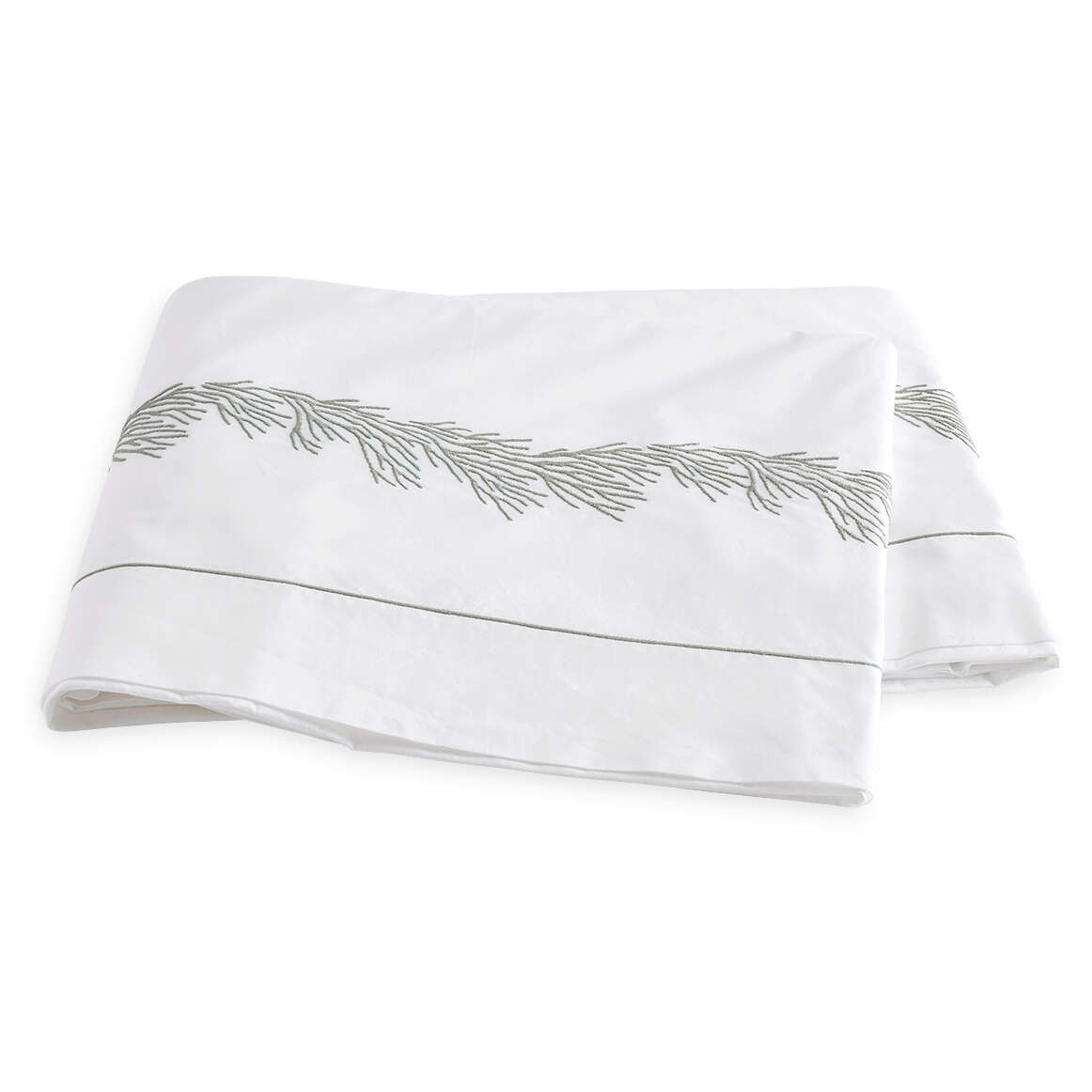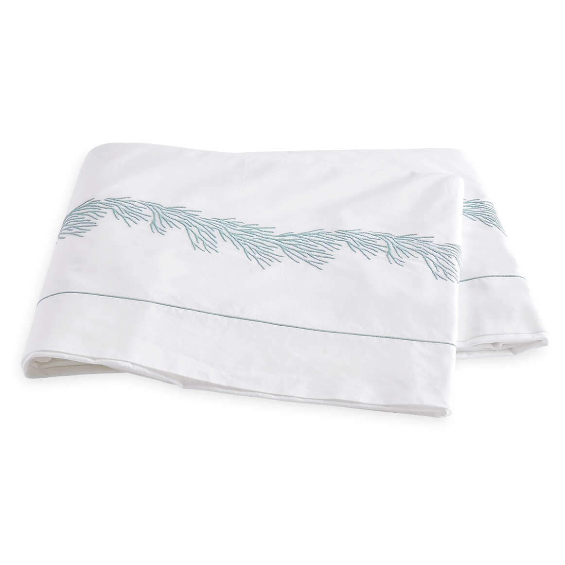 Like the feathery coral found under the Pacific waters, this embroidered pattern gently flows over our crisp 520 thread count Ceylon cotton percale. The design is framed by a small, satin stitch border.