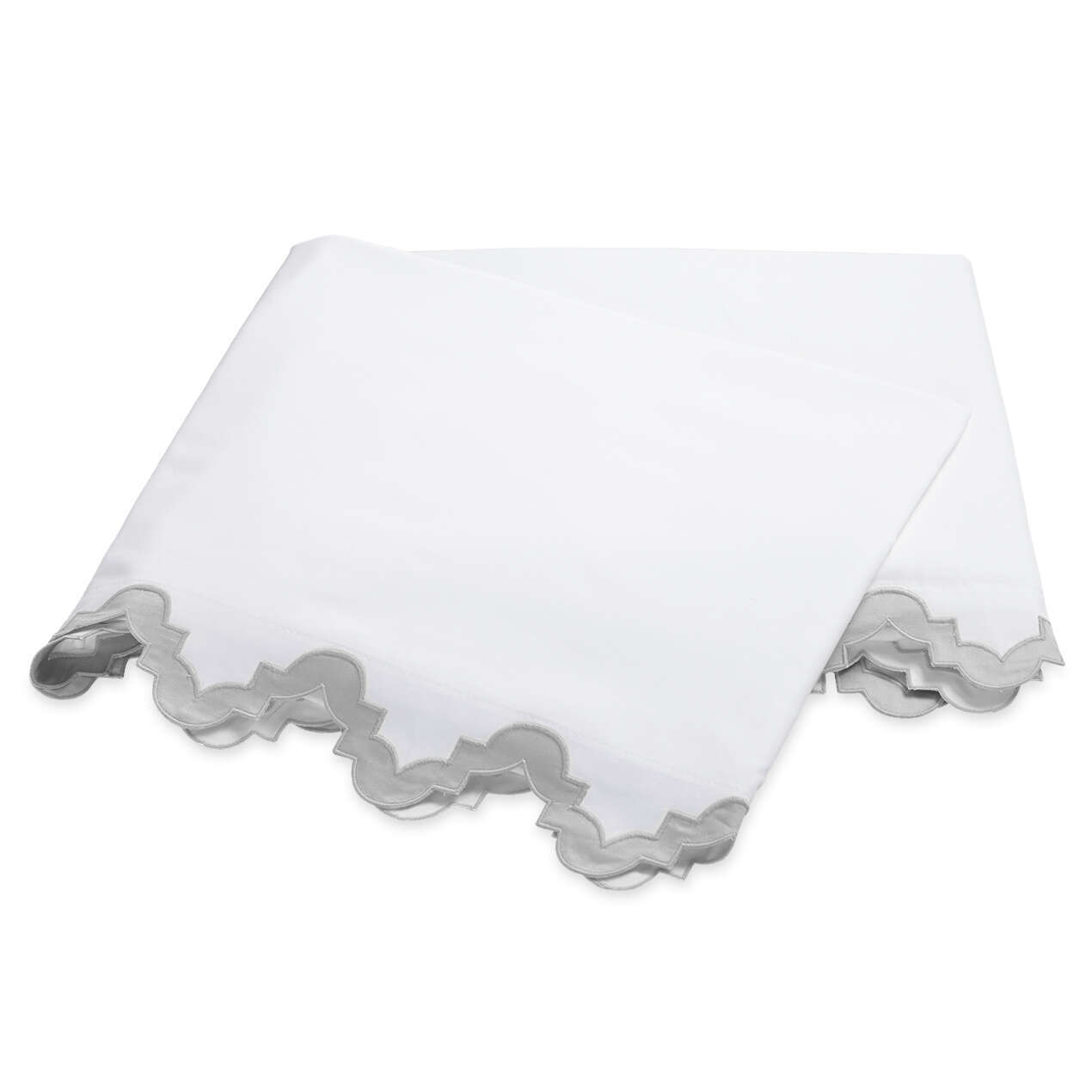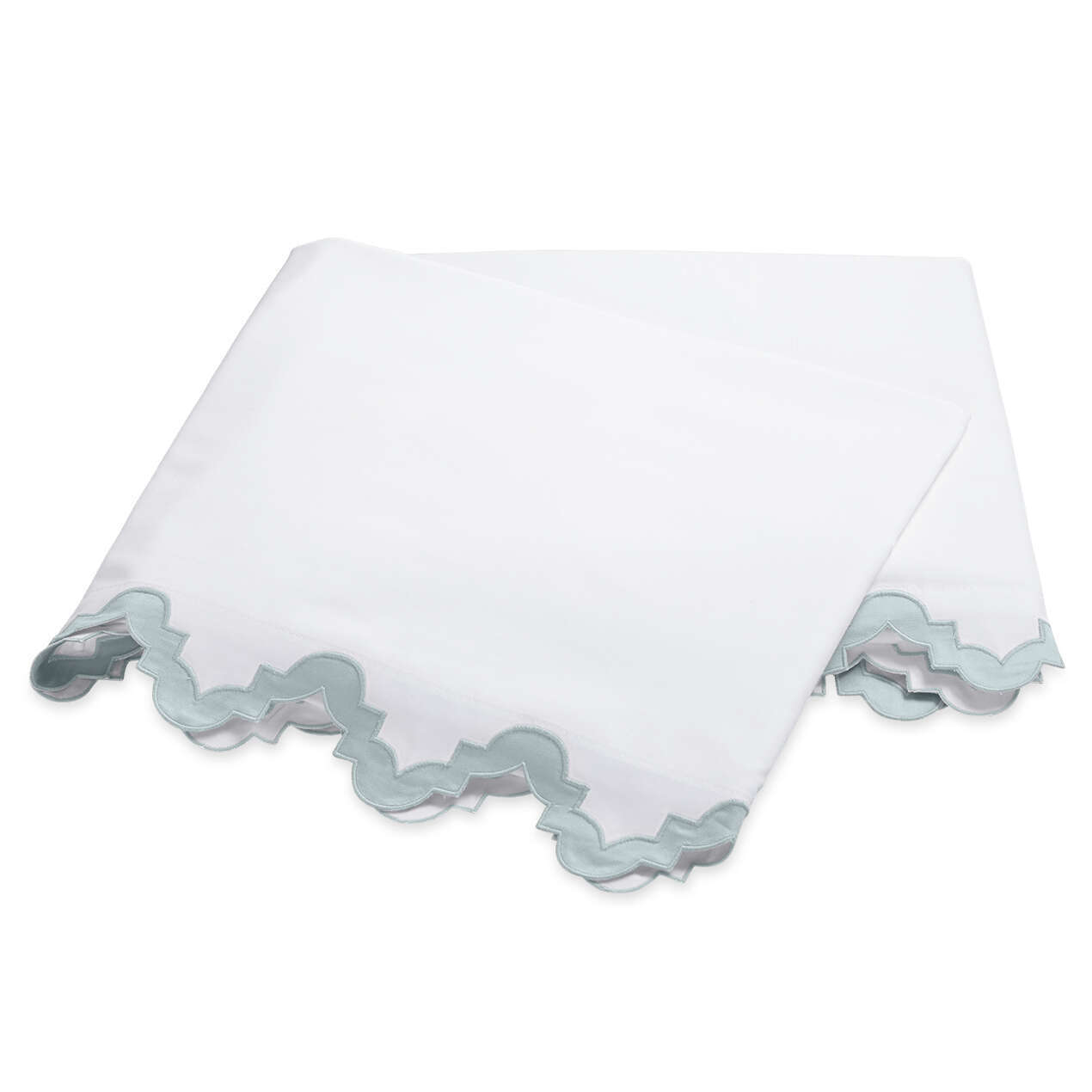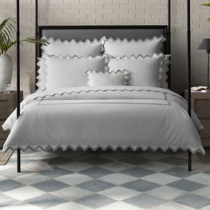 Inspired by the elegant geometry of Moroccan tiles, Aziza (a name that translates to “beloved”) boasts a zig-zag appliqué cut from our Nocturne sateen sewn onto our always popular 600 thread count Milano Egyptian cotton percale sheeting. It’s a slightly exotic, alluring addition to your bedroom.