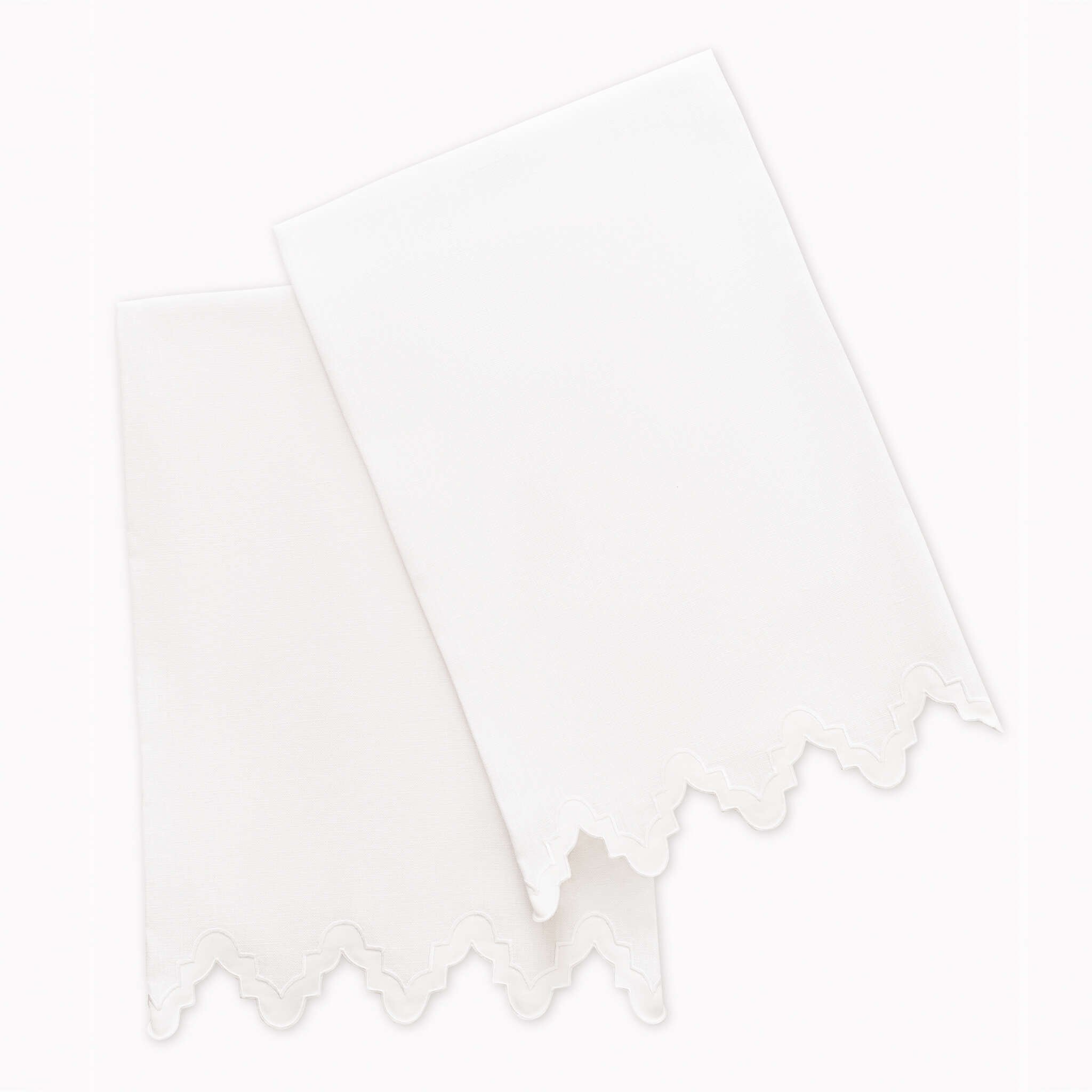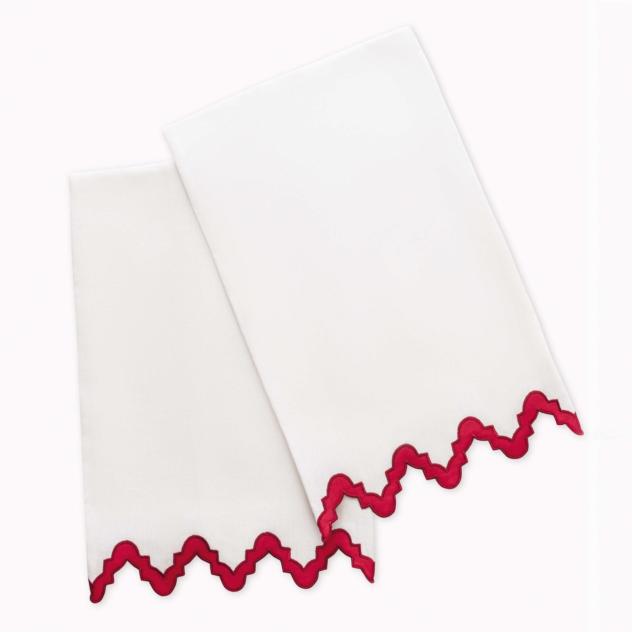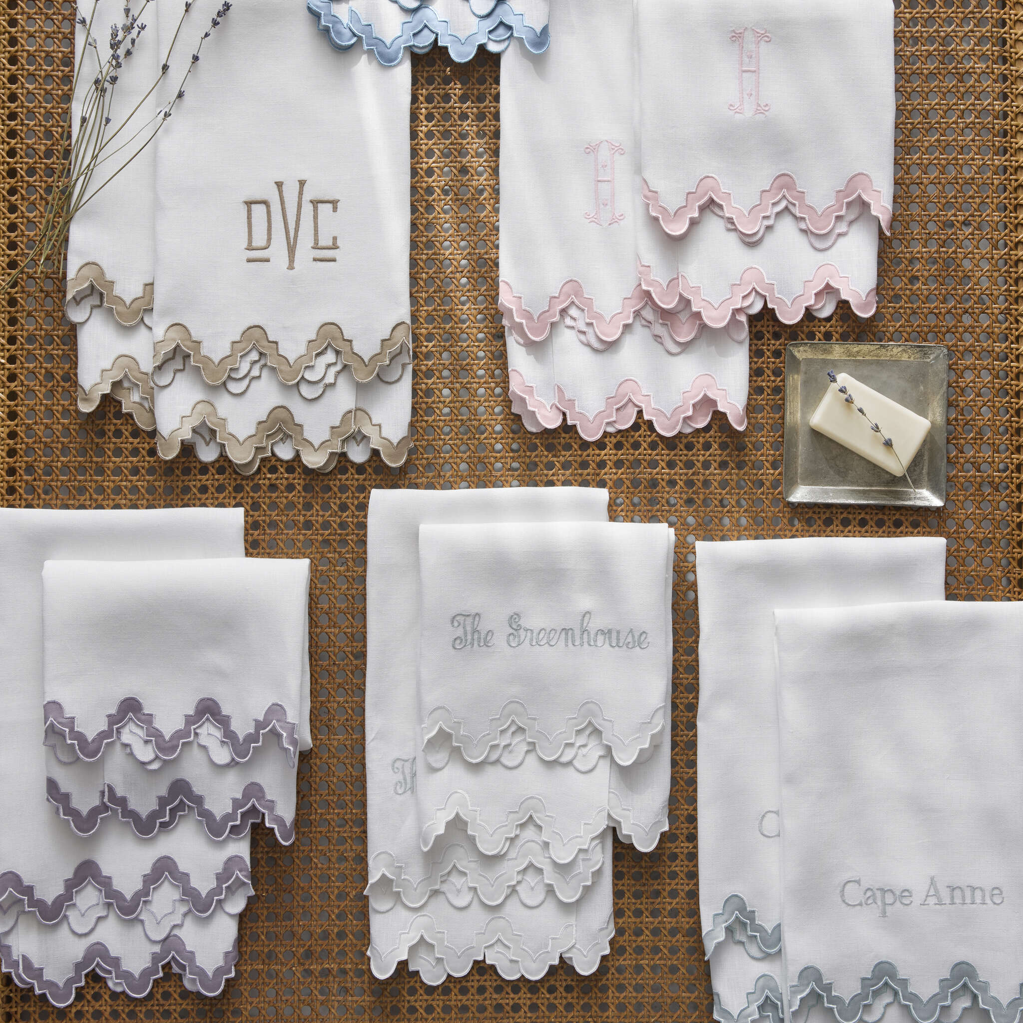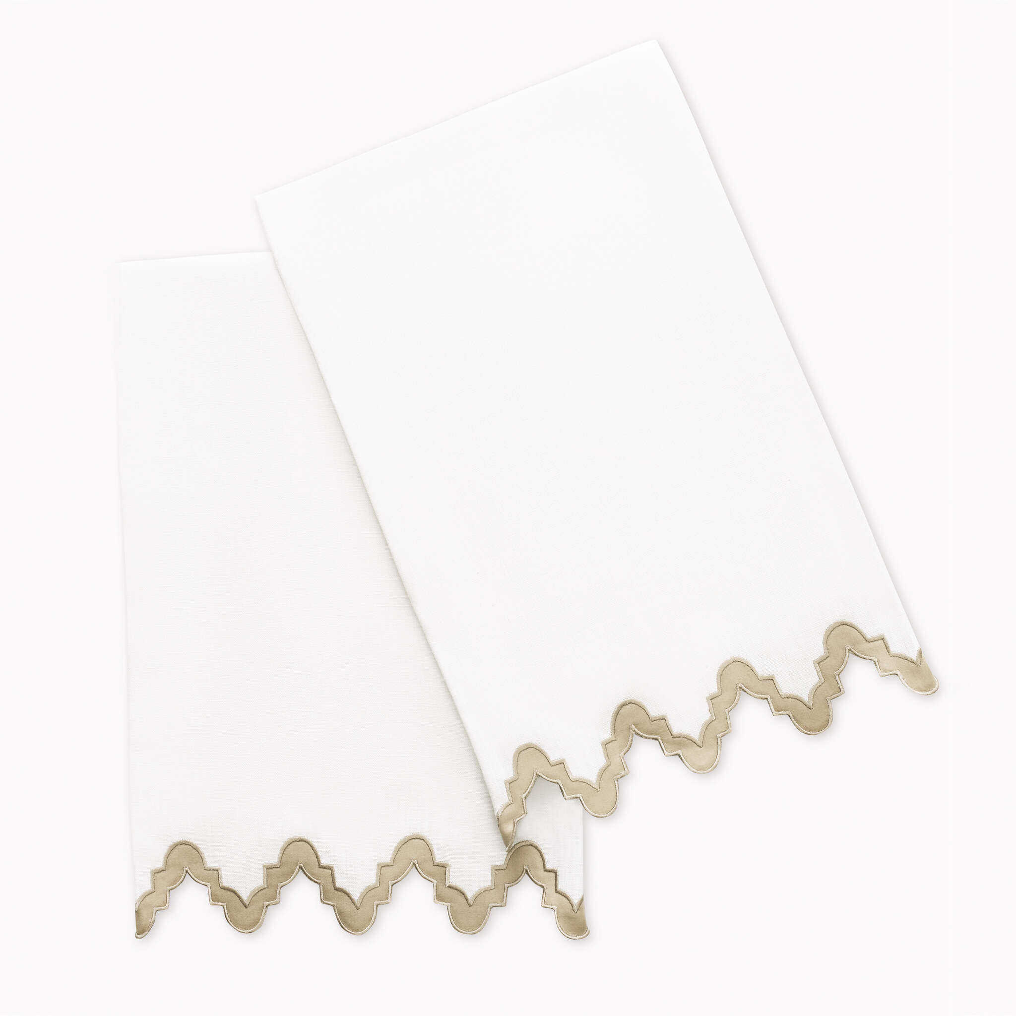 Aziza's alluring zig-zag appliqué in Nocturne sateen adds flourish to linen guest towels, bringing distinctive design to everyday moments.