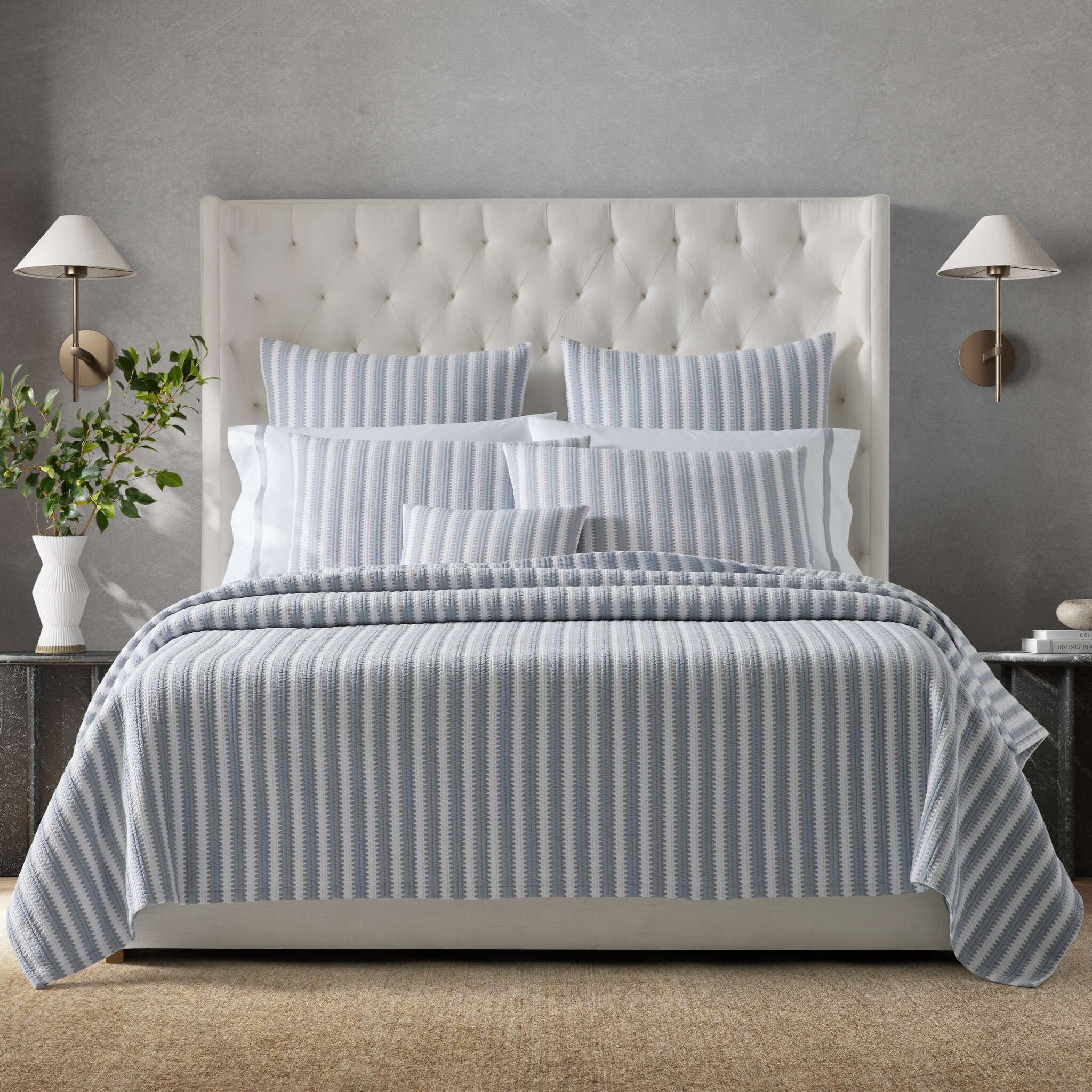 Inspired by a classic Schumacher fabric, our Apollo Stripe Matelassé is an expressive bedding style that blends traditional striping with laidback ease. It features 100% a cotton outer shell with 100% polyester filling.