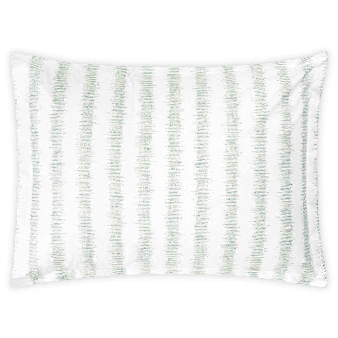 Attleboro, a print drawn from an archival Schumacher design, mimics the distinctive look of dyed textiles; here, Ikat-like blurred strokes are arranged in hazy stripes and printed on our 500 thread count Luca Egyptian cotton percale. Attleboro’s palette of subtle colors matches back beautifully to our bold Pomegranate print, bringing a modern verve to that traditional pattern.