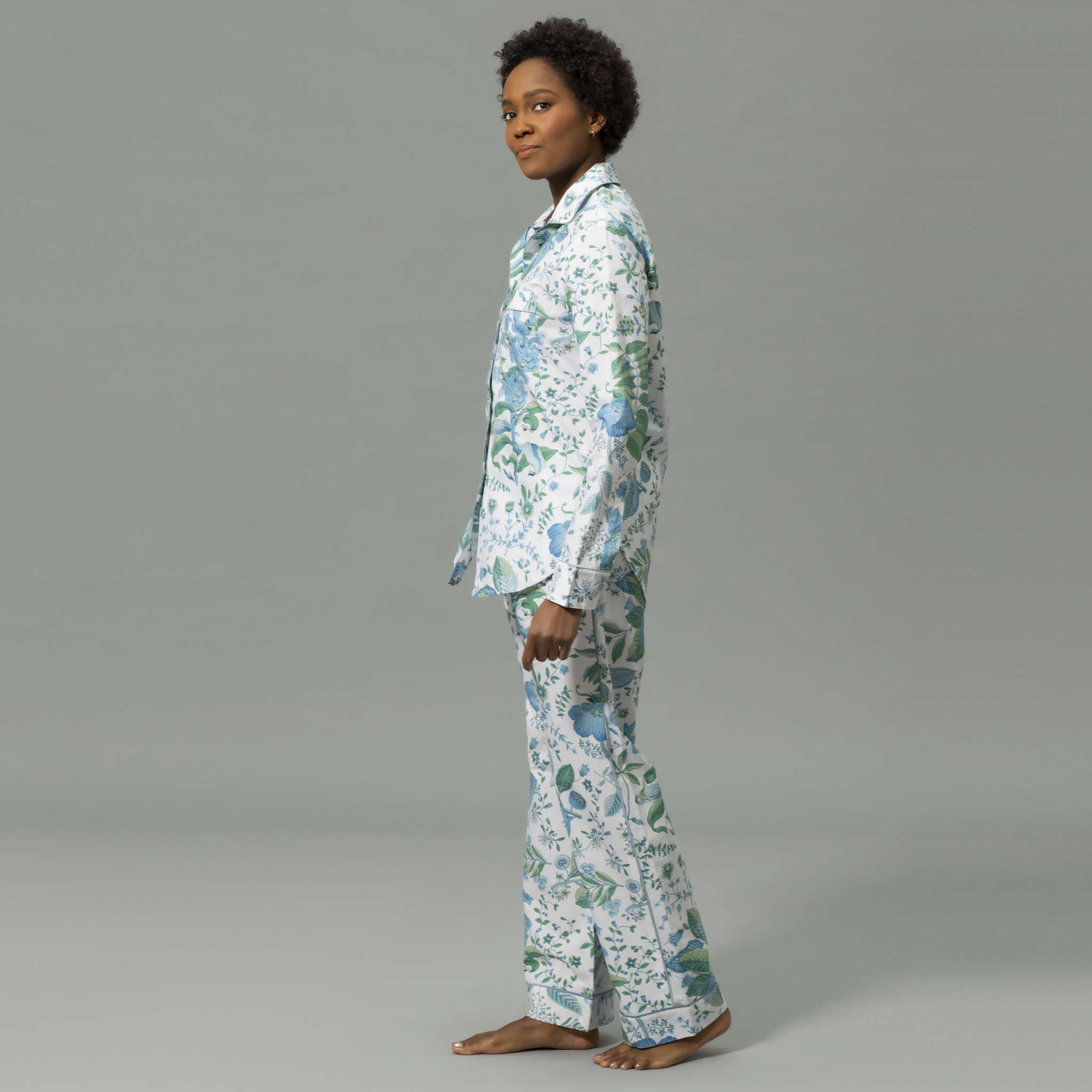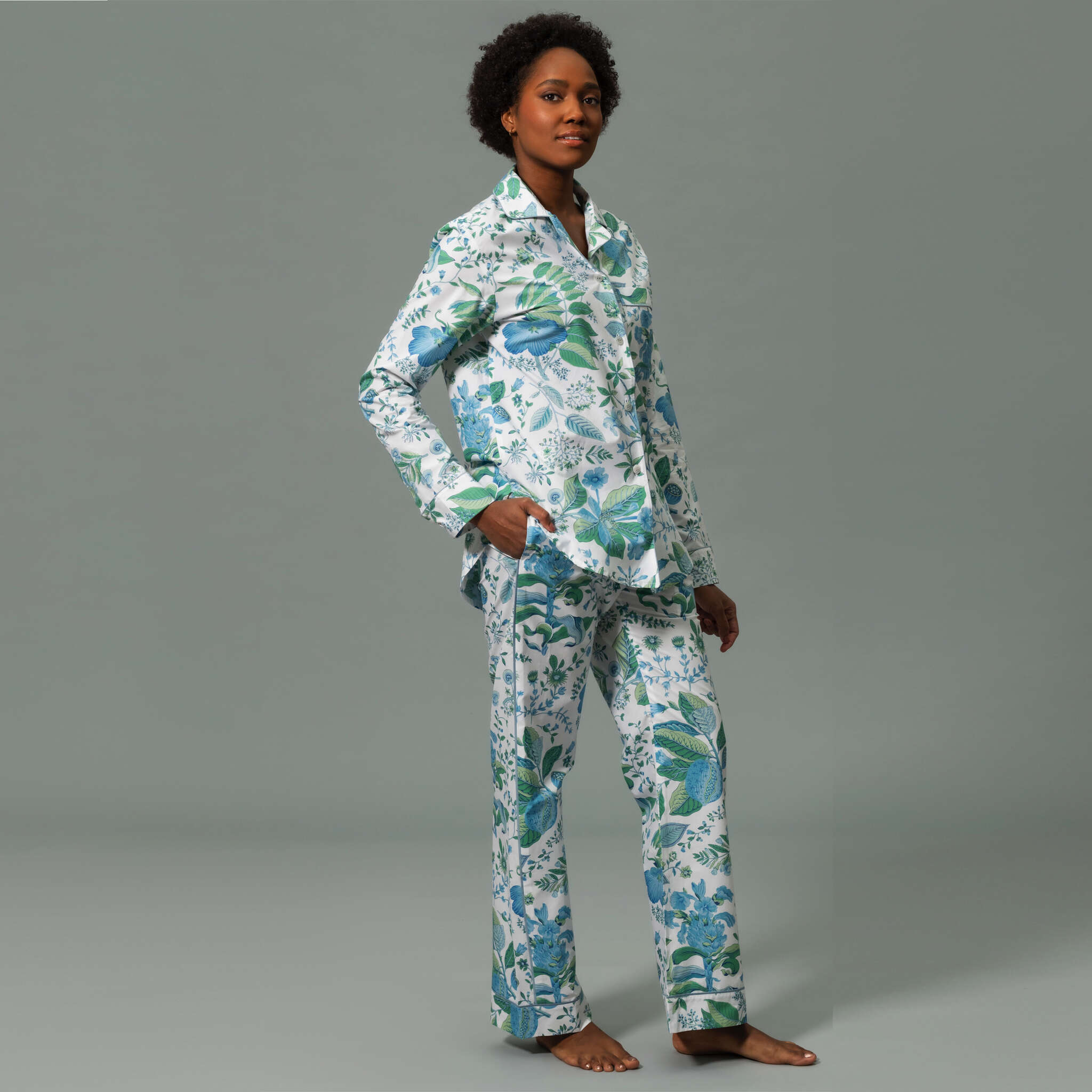 Crafted from our dreamy Luca cotton percale in a range of vibrant Schumacher prints, we’ve combined the luxury of Matouk sheeting with the comfort of your favorite lived-in dress shirt. The top features natural corozo buttons, piped details, and a scooped hem. The drawstring trousers have elastic in the back for extra comfort and a flattering fit. Beautifully tailored, these pajamas are just as chic outside the house as they are in the bedroom. Each set arrives in a Matouk gift box.