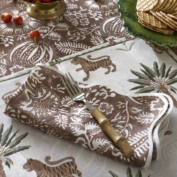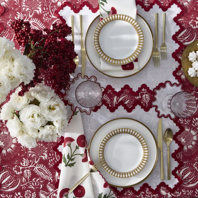Hand-dyed textiles serve as inspiration for this intricate Schumacher botanical that places the symbolic pomegranate at its center. Perhaps history's most revered fruit, the pomegranate is believed to represent marriage, birth, prosperity, hope and abundance, adding meaning and merriment to these new table linens; finished with our scallop piped edge.