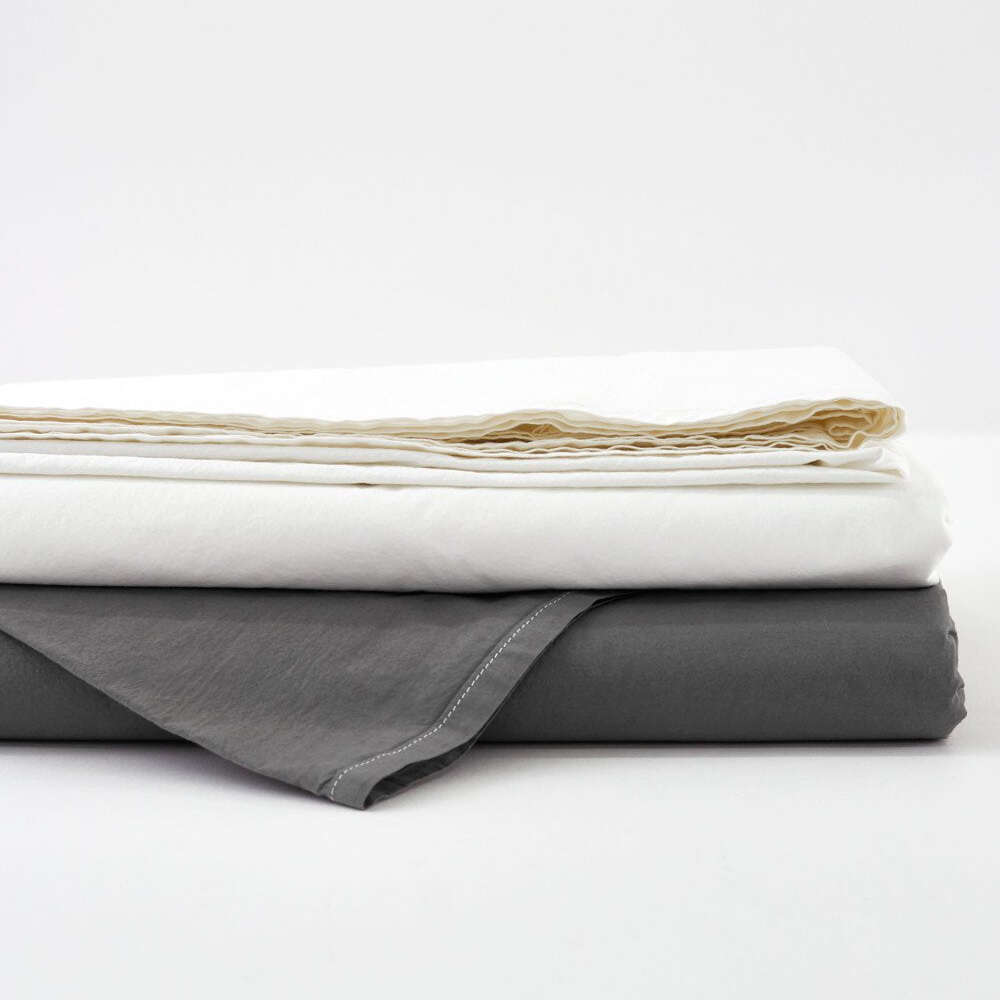 Tru has exactly the same construction as our signature Vintage Linen Bedding - knife edge finish on the duvets, shams, and pillowcases, and 1/2" hem detail on the flat sheets. The Tru collection is a very light and soft hand, and controls for shrinkage.