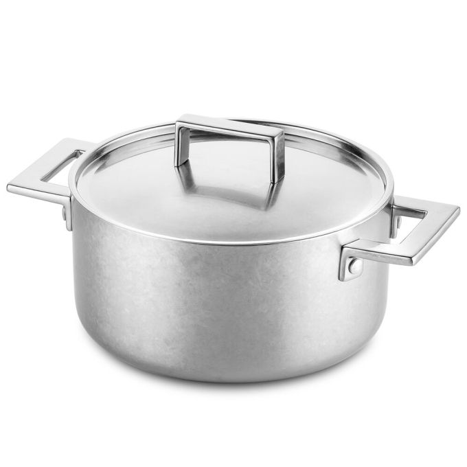 Minimalist design for this collection of high-performance pots and pans. The high conductivity of pure aluminum merges with the practicality and hygiene of steel. 18/10 Stainless Steel, aluminum core, Induction Steel outside. Inside and outside mirror polished surfaces. Handles with strongly fixed 18/10 Stainless Steel rivets. The heat is distributed evenly over the surface of the pot. Greater control of cooking temperature. Considerable saving of energy and time. Minor alteration of vitamins and proteins during cooking. These pans are quite practical, too. These pans are 100% dishwasher-safe and won't corrode, oxidize or stain. The special Vintage Process gives to the surface of stainless steel a rustic, warm and elegant appearance.