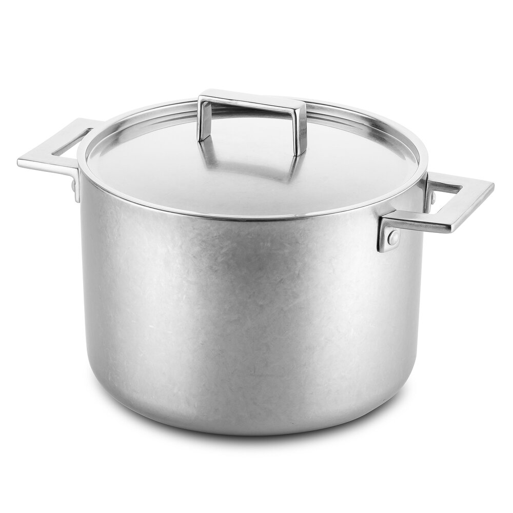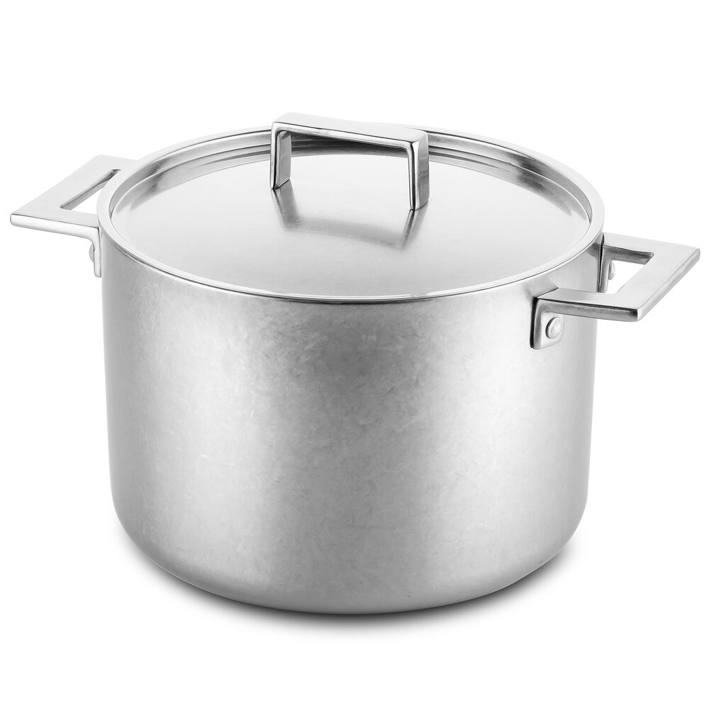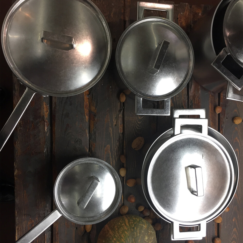 Minimalist design for this collection of high-performance pots and pans. The high conductivity of pure aluminum merges with the practicality and hygiene of steel. 18/10 Stainless Steel, aluminum core, Induction Steel outside. Inside and outside mirror polished surfaces. Handles with strongly fixed 18/10 Stainless Steel rivets. The heat is distributed evenly over the surface of the pot. Greater control of cooking temperature. Considerable saving of energy and time. Minor alteration of vitamins and proteins during cooking. These pans are quite practical, too. These pans are 100% dishwasher-safe and won't corrode, oxidize or stain. The special Vintage Process gives to the surface of stainless steel a rustic, warm and elegant appearance.
