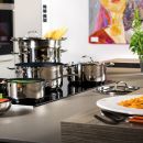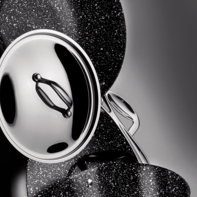 Elegance meets functionality. A return to the origins: healthy and natural cooking with premium 18/10 stainless steel, the same used in hospitals for its hygiene and durability. No coating — just pure steel to enhance the true flavor of food. 18/10 Stainless Steel sandwiched thermoradiant bottom (18/10 Stainless Steel - Aluminum - Steel for Induction). Reinforced non-drip edge. The handles are welded with no interior rivets, ensuring a smooth, hygienic, and easy-to-clean surface. The mirror-polished finish adds elegance and refinement. The internal measuring scale allows for precise dosing of liquids without the need for additional tools. Ergonomic handle: designed to ensure a secure and comfortable grip.