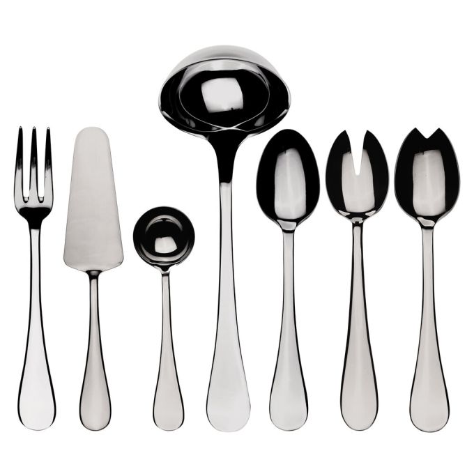 7 Pieces Serving Set: Serving Spoon 9.66"L, Serving Fork 9.66"L, Salad Serving Spoon 9.5"L, Salad Serving Fork 9.66"L, Cake Server 9.5"L, Ladle 12.4"L, Gravy Ladle 7.1"L.