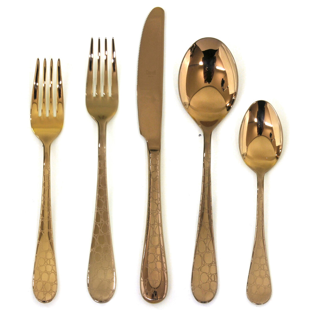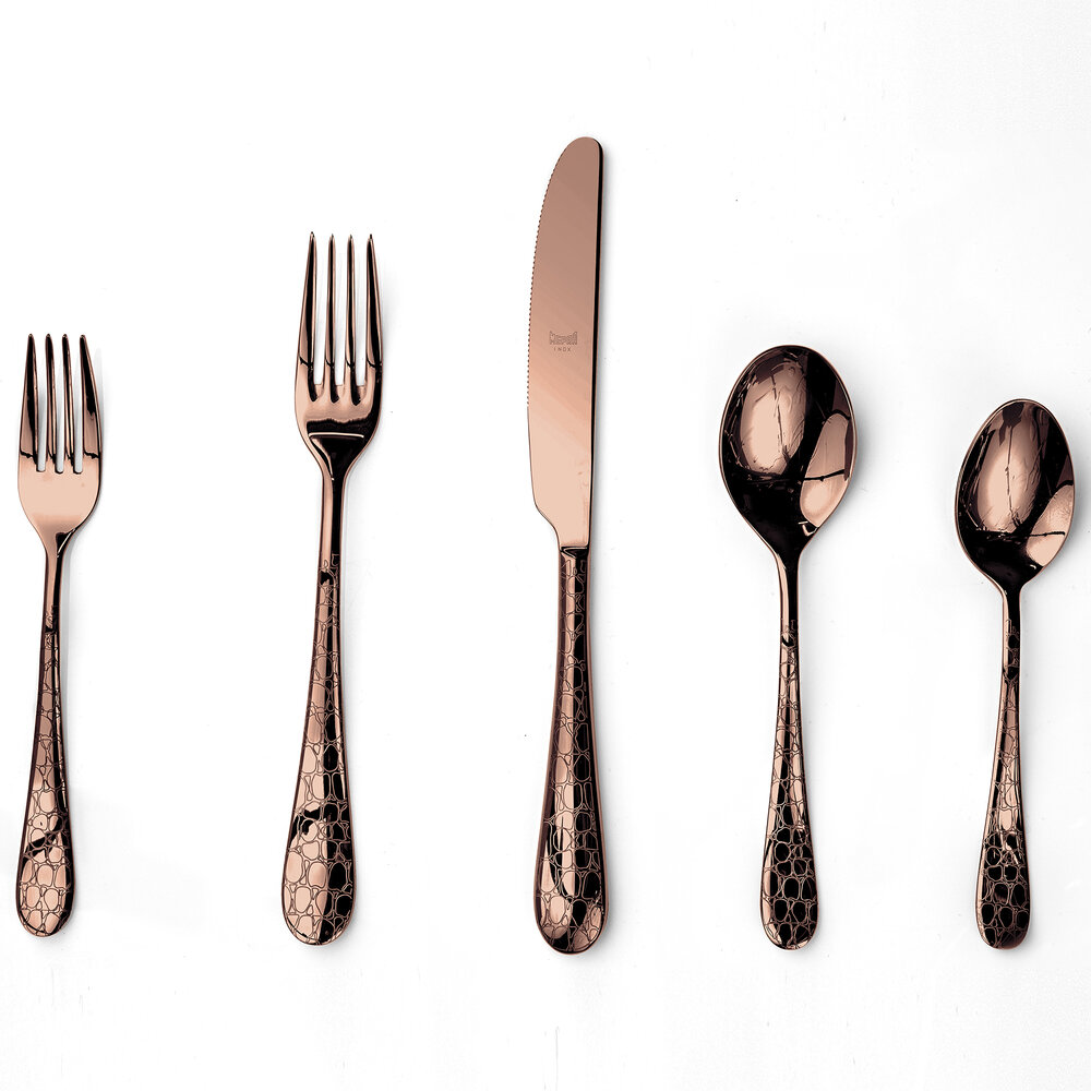 The Coccodrillo cutlery set by Mepra is a unique set of cutlery, exclusively designed in Italy by Mepra designers. The pattern on each piece reminds of a crocodile skin and adds extra style and elegance to the set. Made in 18/10 stainless steel and skillfully hand-painted with electronic laser engraver and the same skills used by ancient craftsmen.