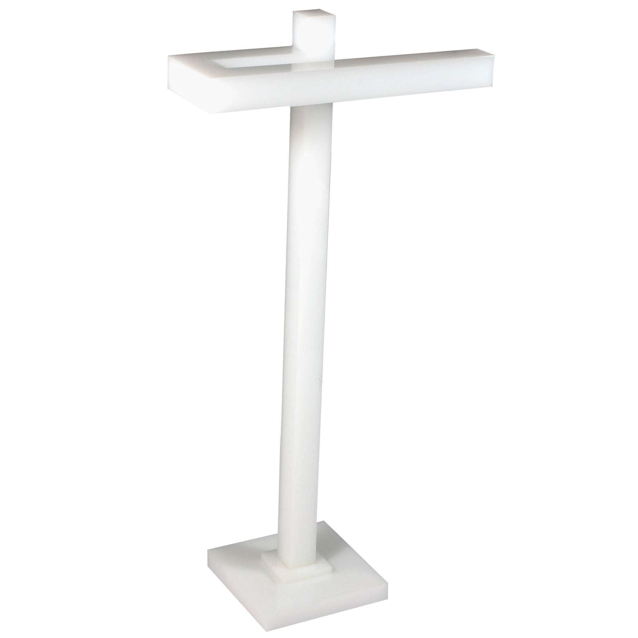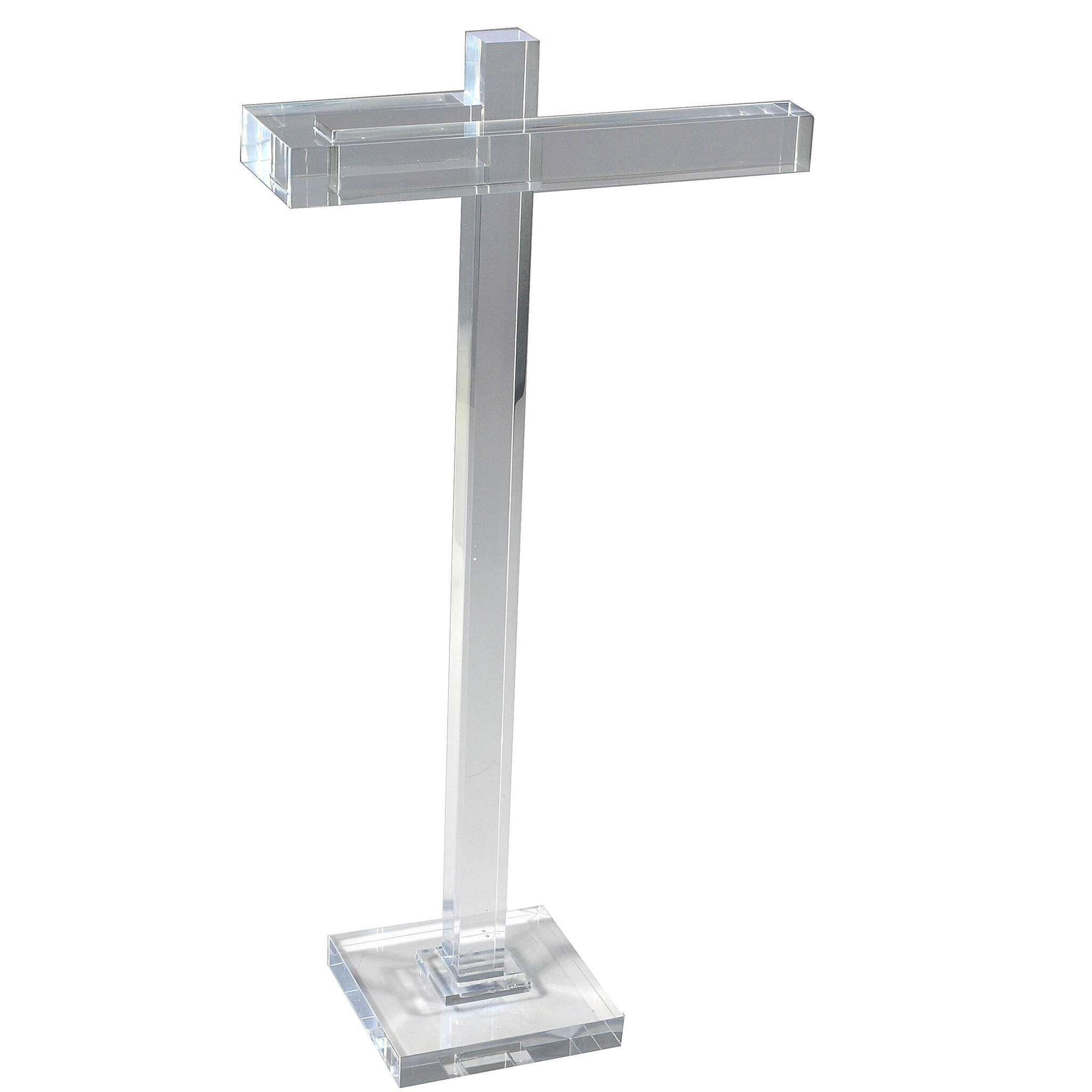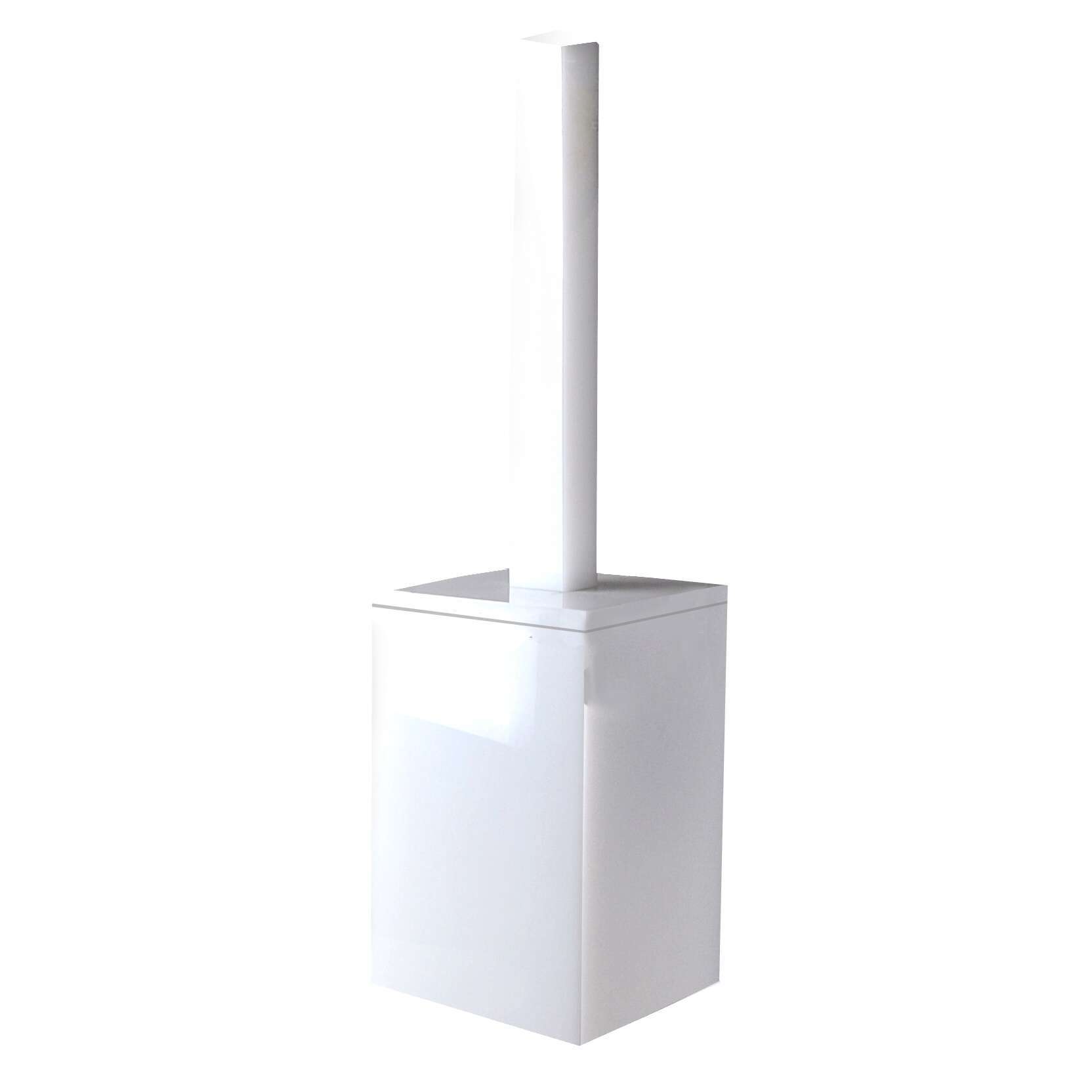 Standing mirrors, guest towel holders and toilet brush holders designed in clean profiles using sleek clear and white Lucite.