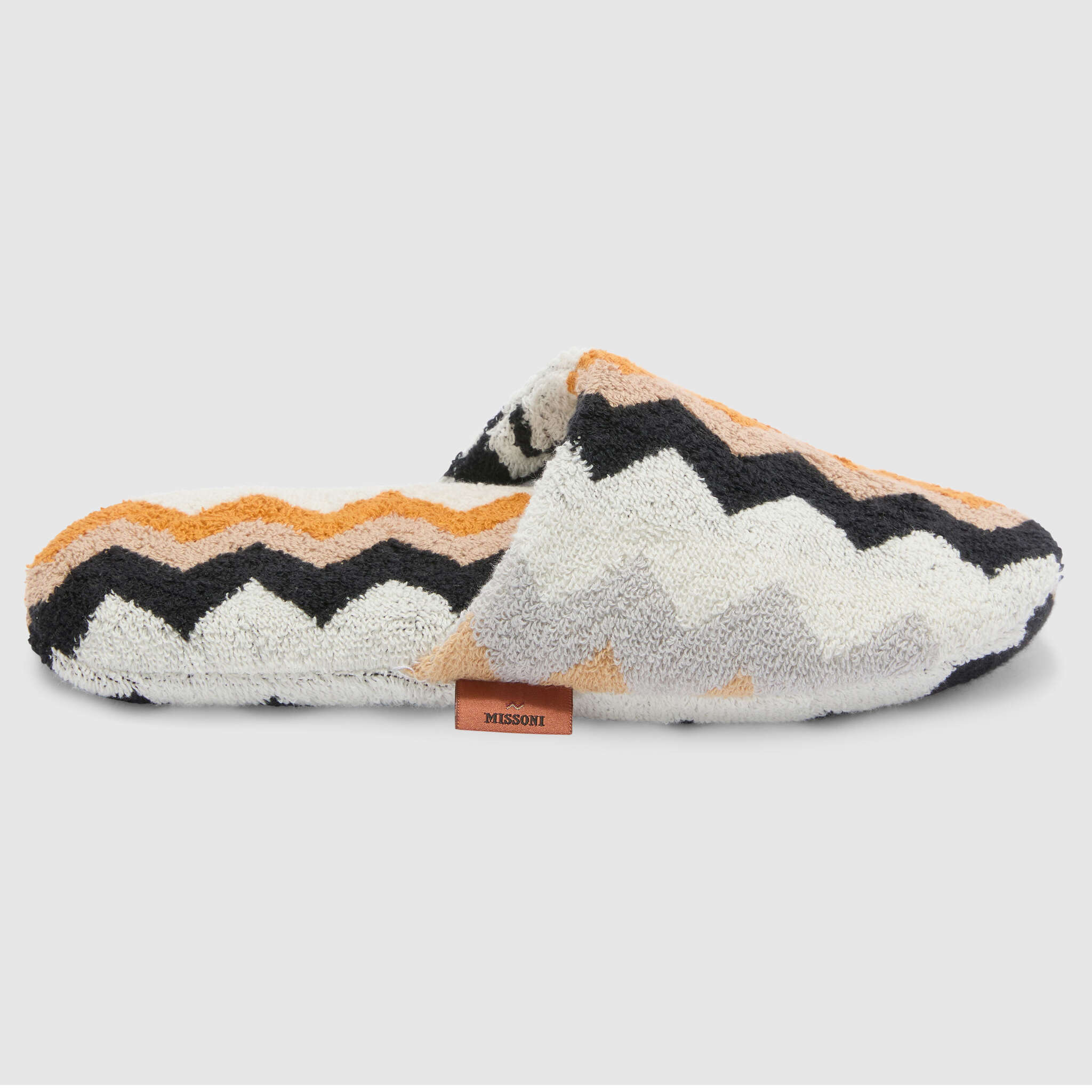 The Missoni slippers, crafted from soft cotton, combine comfort and sophistication in an iconic design. The unmistakable zigzag pattern adds a touch of lively elegance, perfect for moments of relaxation. Finished with a visible logo label, these slippers are the ideal accessory to envelop your feet in distinctive and cozy style.