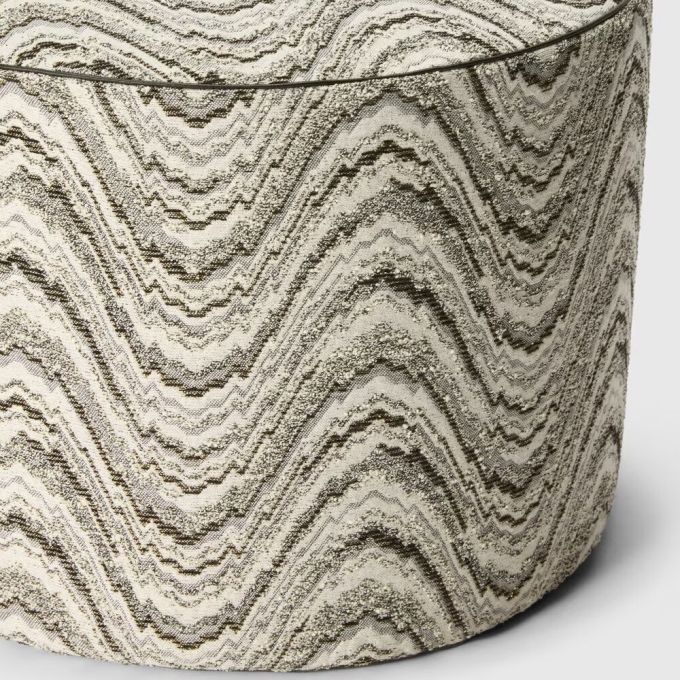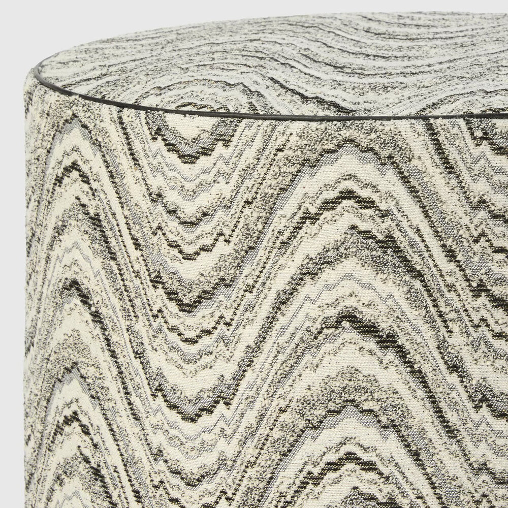 The Ortigia cylindrical pouf crafted in a viscose and cotton blend, is enhanced by a wave motif that animates the surface with a fluid and continuous rhythm. A compact and decorative furnishing complement designed to introduce a refined graphic accent into interiors.