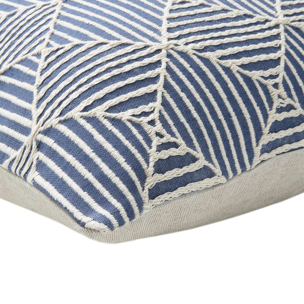 Blue and white stripes play in a geometric pattern in this visually intriguing decorative pillow.