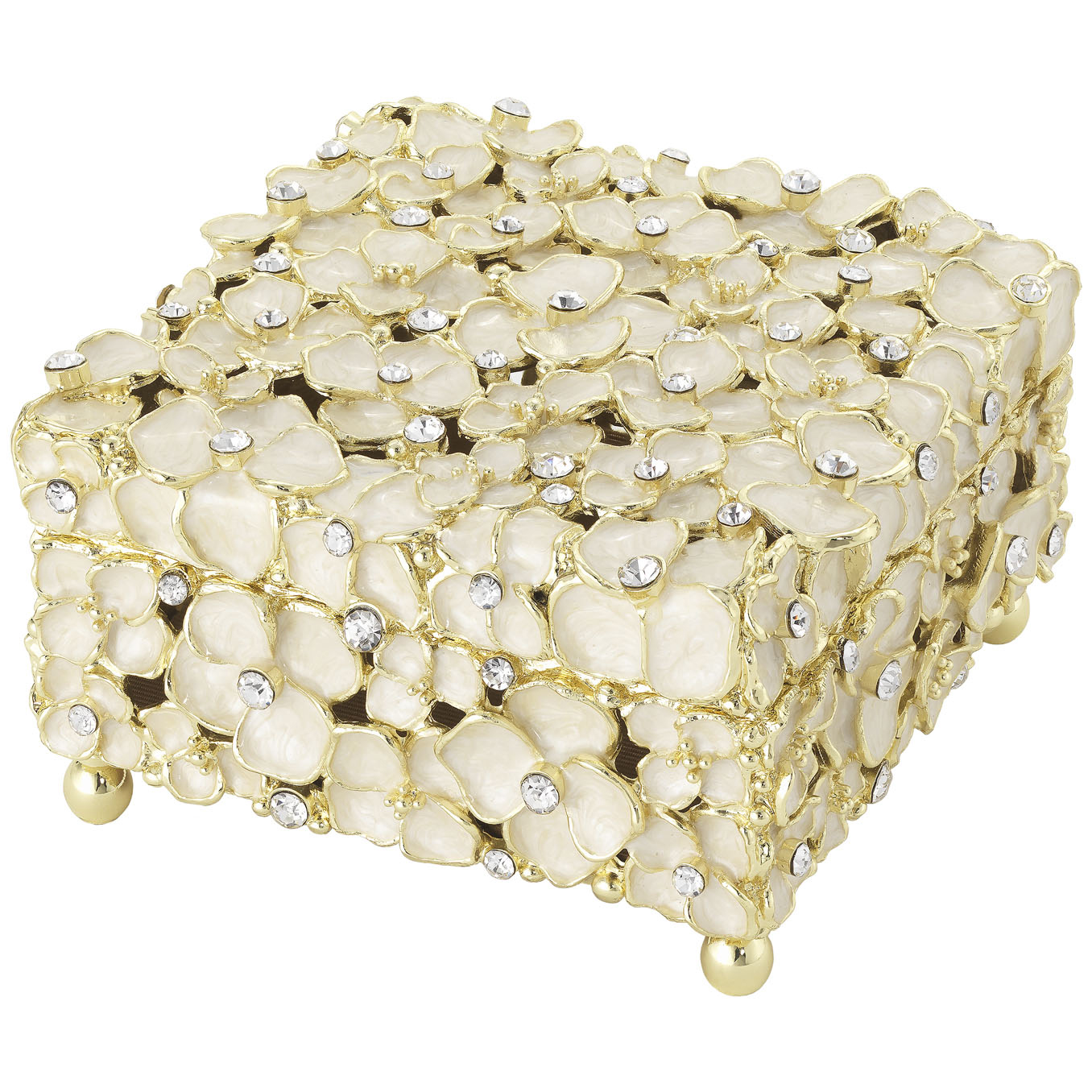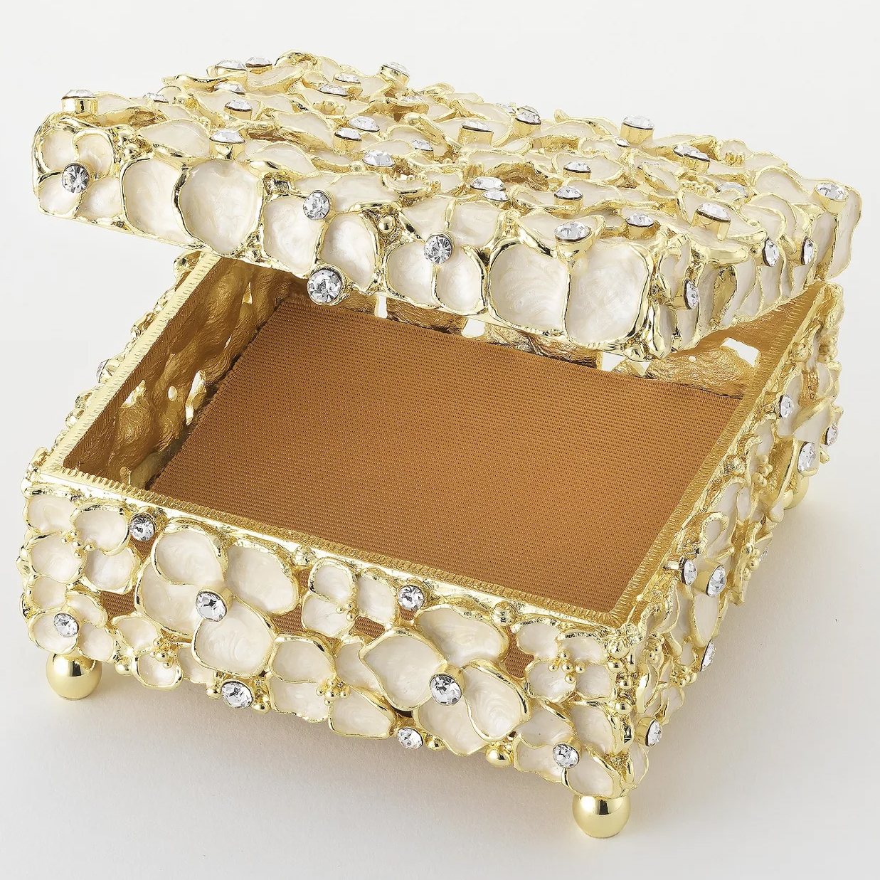 Delicate dogwood blossoms richly cast in a gold finished pewter box with intricate ivory hued hand-enameling and hand-set clear European crystals. Champagne hued moiré silk interior. Tarnish resistant. Signature luxury gift box included.