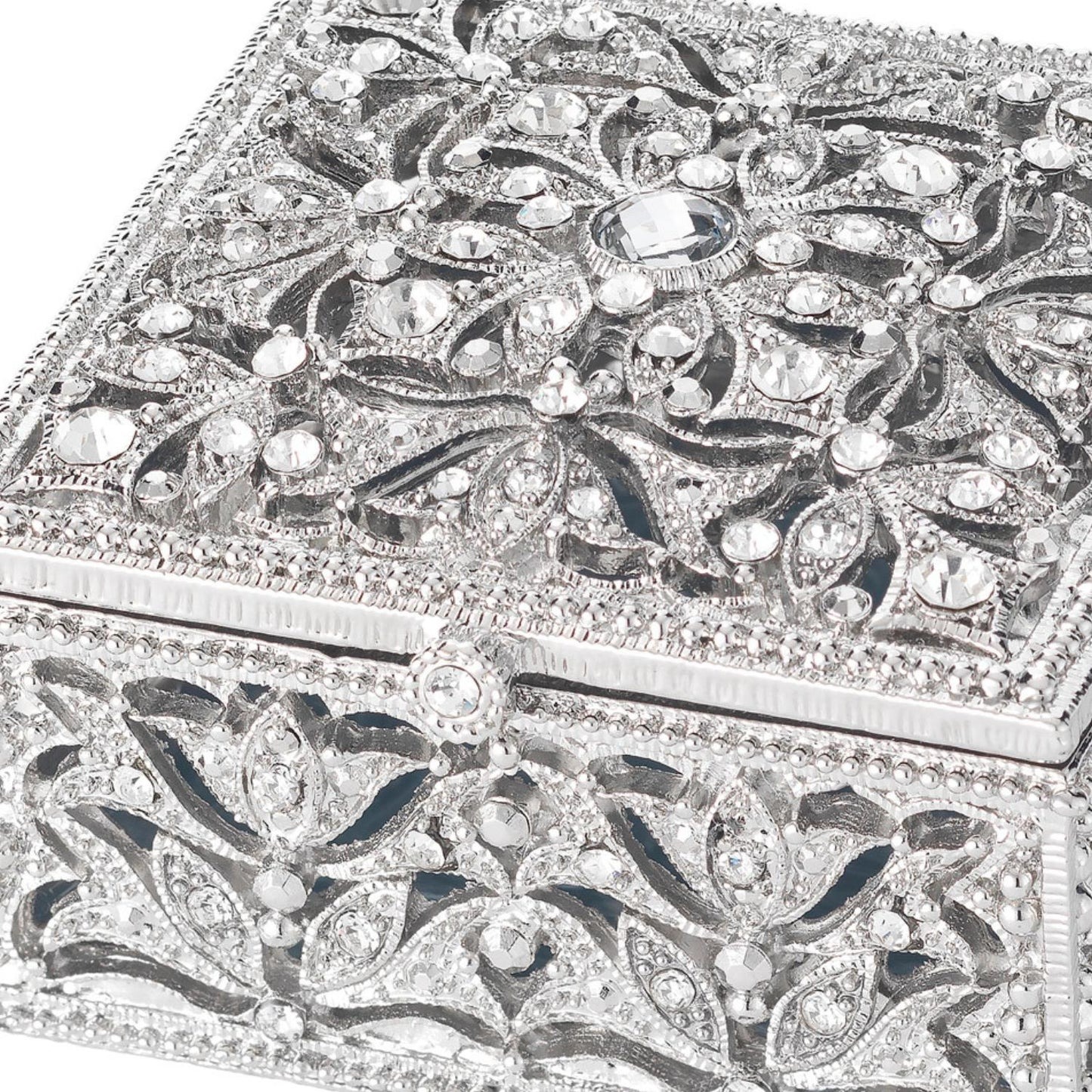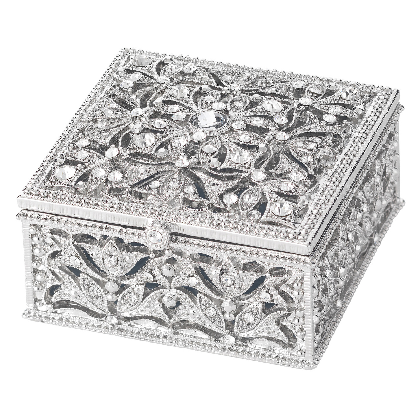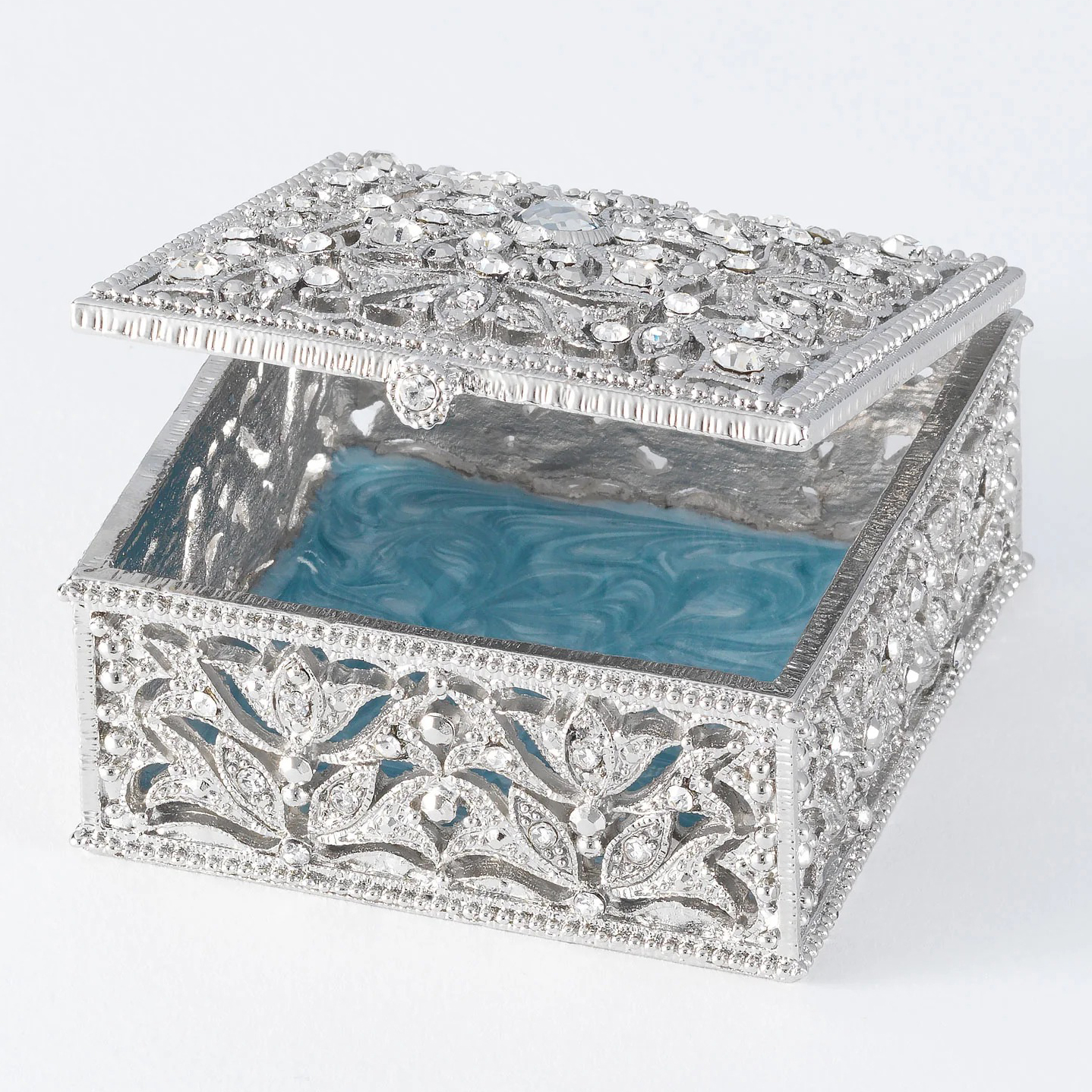 Delightful silver finished pewter filigree box, encrusted with hand-set clear European crystals. Hinged lid. Blue hand-enameled interior. Tarnish resistant. Signature luxury gift box included.