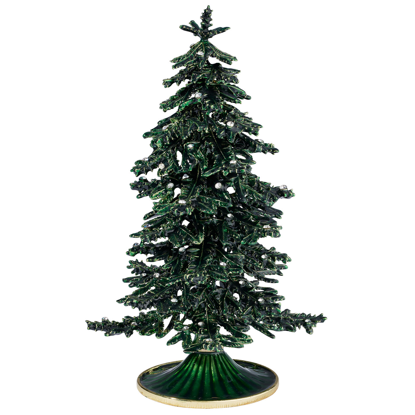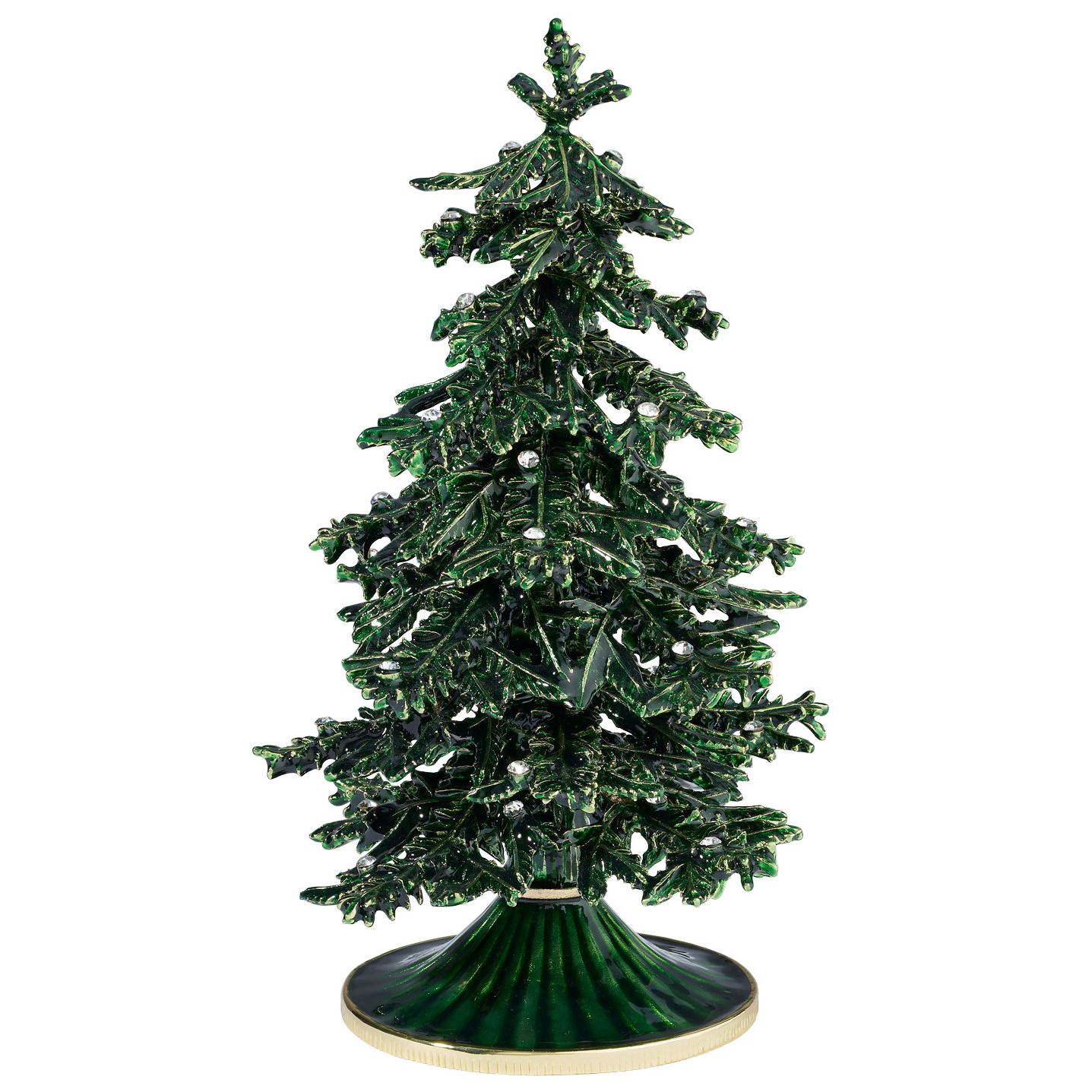 Heirloom worthy gold finished pewter Christmas tree objet, with lush green hued hand-enameling and hand-set clear European crystals. Tarnish resistant. Signature luxury gift box included.