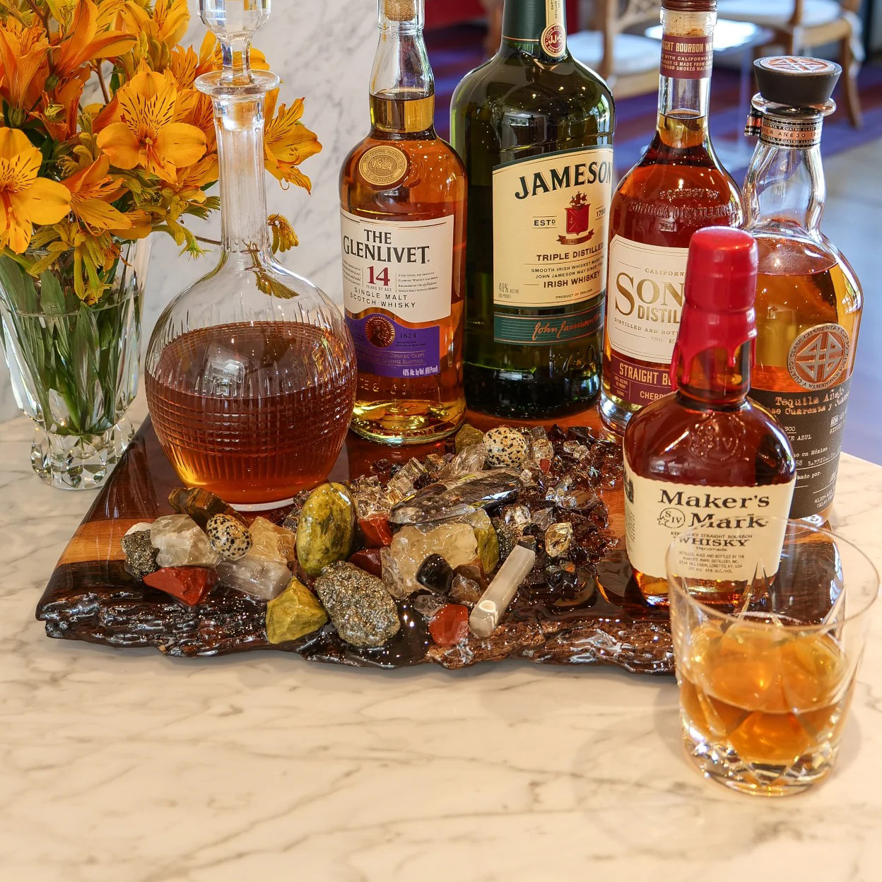 Each Kodama Charcuterie Board is a unique, handcrafted, functional work of art. Blending beauty with function, the 360 degree rotating board is made from rich black walnut and hand-lacquered with a clear non-porous food-safe resin, showcasing the exquisite grain of the renowned American hardwood.