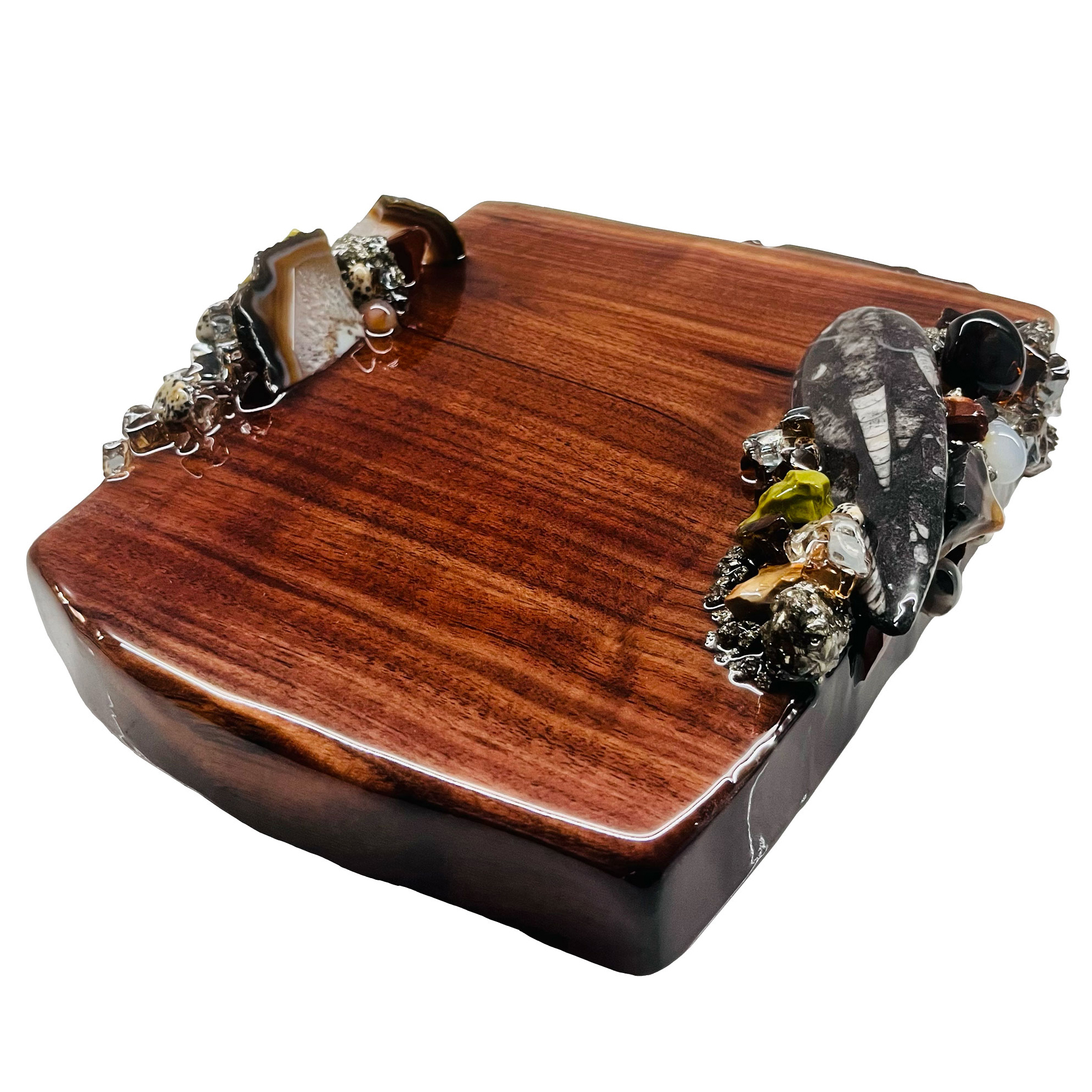 Each Kodama Vanity Tray is a unique, handcrafted, multi-functional work of art. Blending beauty with function, the Vanity Tray is made from rich black walnut and hand-lacquered with a clear non-porous food-safe resin, showcasing the exquisite grain of the renowned American hardwood.