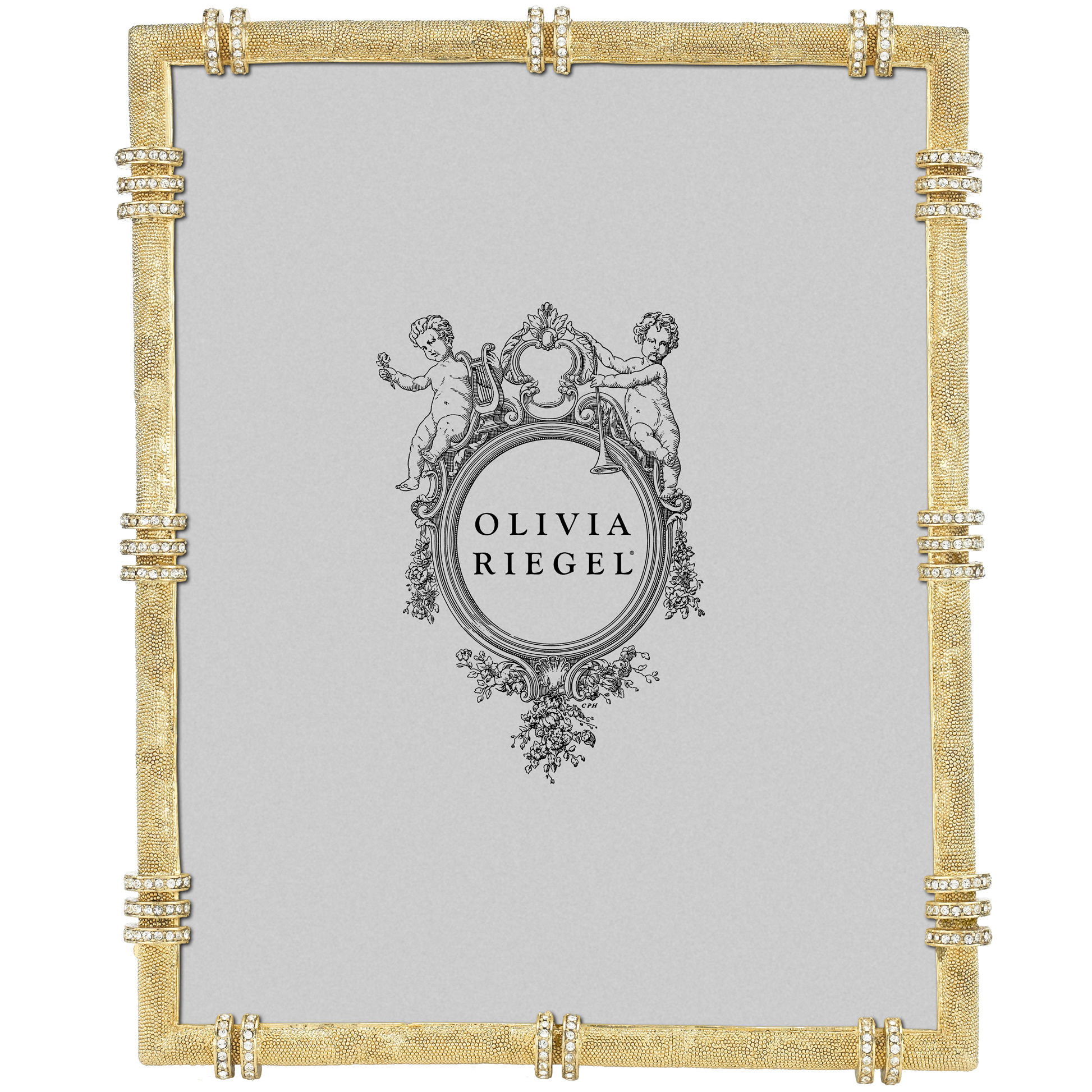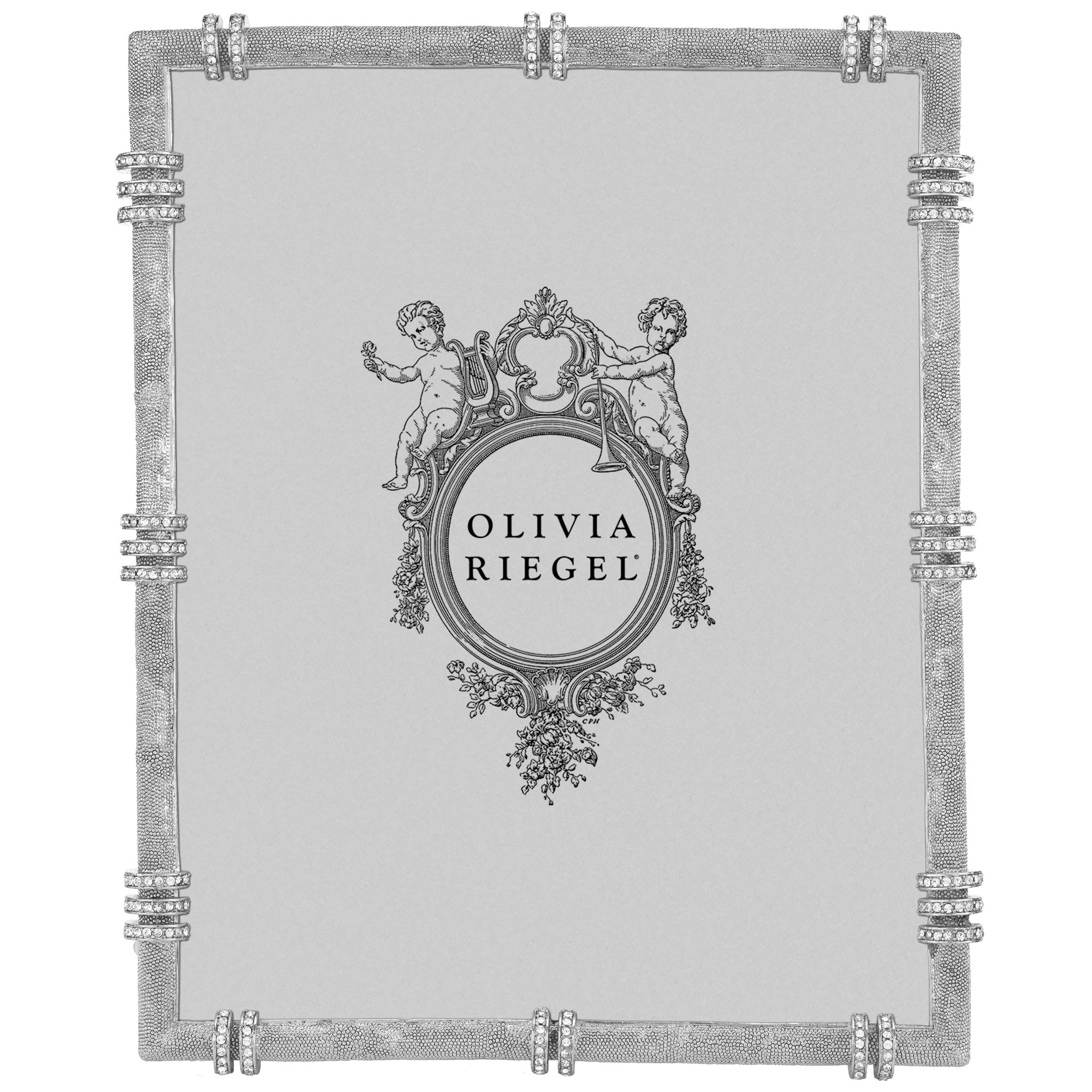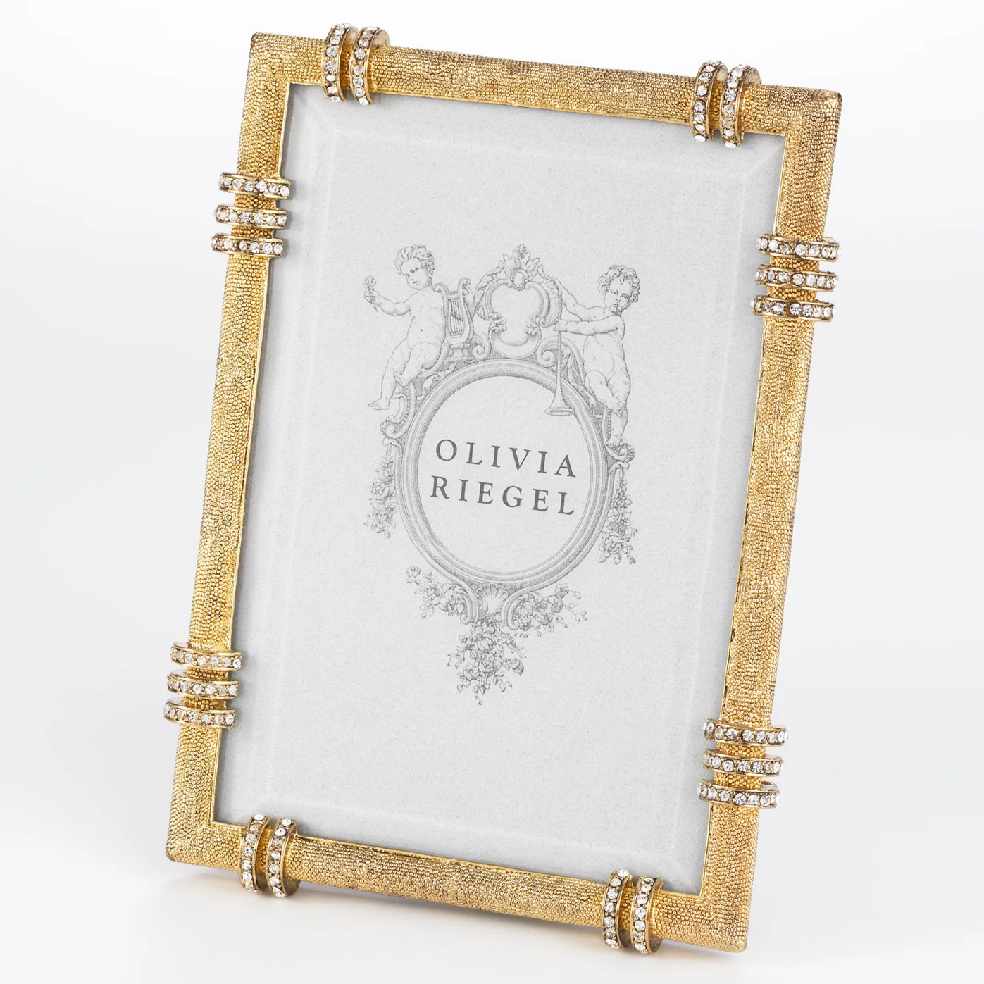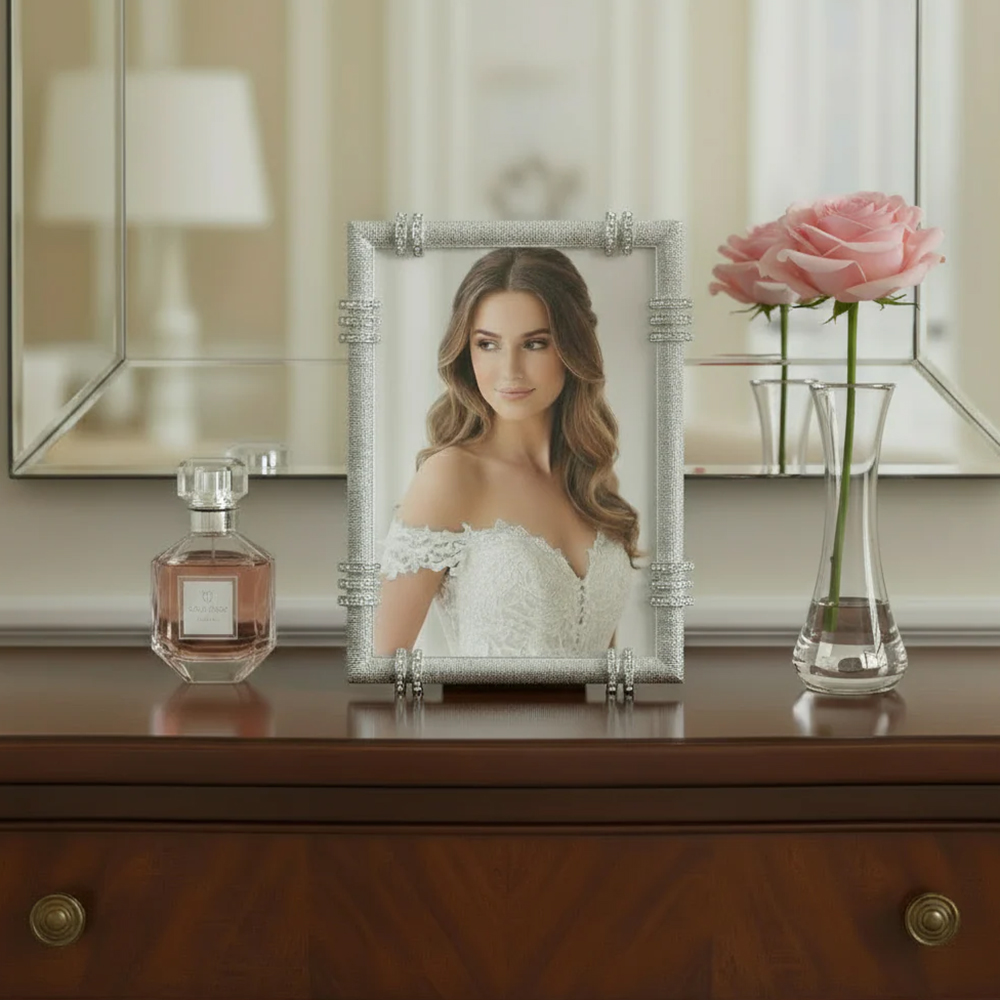 Channel-set clear European crystal banding in a cast pewter picture frame with textured gold or silver tone metal finish. Elegant moiré silk back with easel for vertical or horizontal placement. Beveled glass. Tarnish resistant. Signature luxury gift box included.