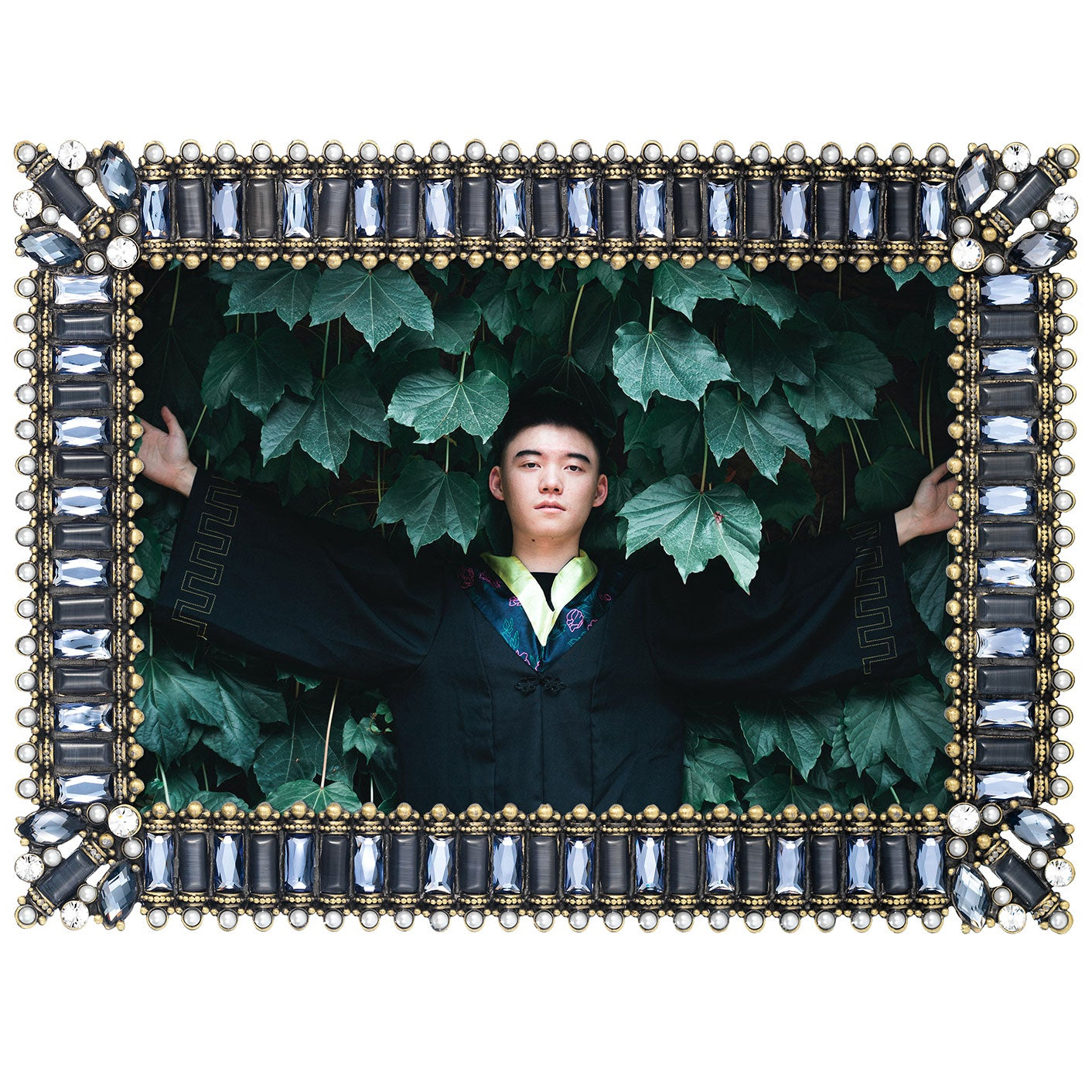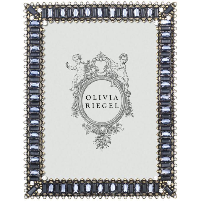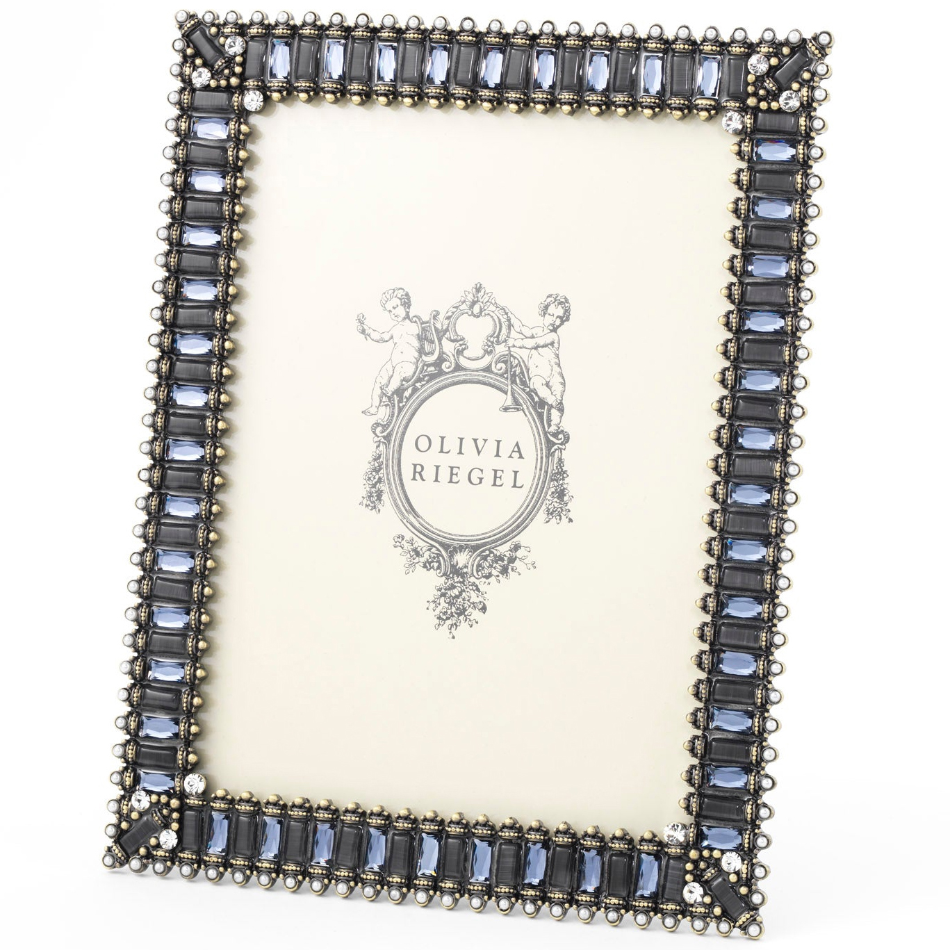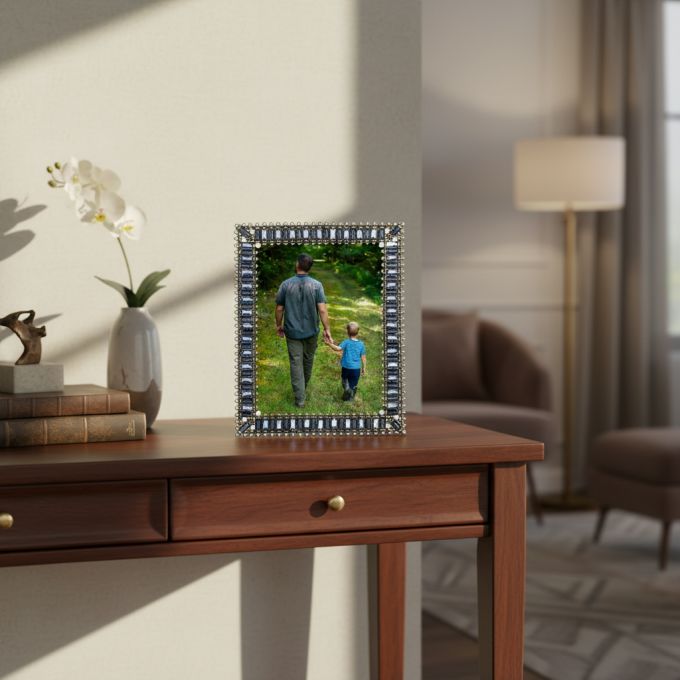 Hand-set clear European crystals, sapphire glass gems, blue cats eye, and faux pearls in a bronze metal finish picture frame. Elegant moiré silk back with easel for vertical or horizontal placement. Tarnish resistant. Signature luxury gift box included.