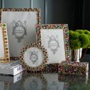 An enchanting trove of cheerful and eye-catching color. Gold finished cast pewter picture frame with hand-set multi-colored European glass gems. Elegant champagne hued moiré silk back, with easel designed for vertical or horizontal placement. Beveled glass. Tarnish resistant. Signature luxury gift box included.