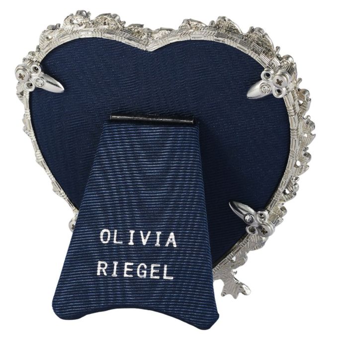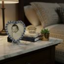 Delicate gold or silver finished pewter picture frame with a heart design, adorned with hand-set sapphire European crystals and blue faux pearls. Elegant navy hued moiré silk back. Tarnish resistant. Signature luxury gift box included.