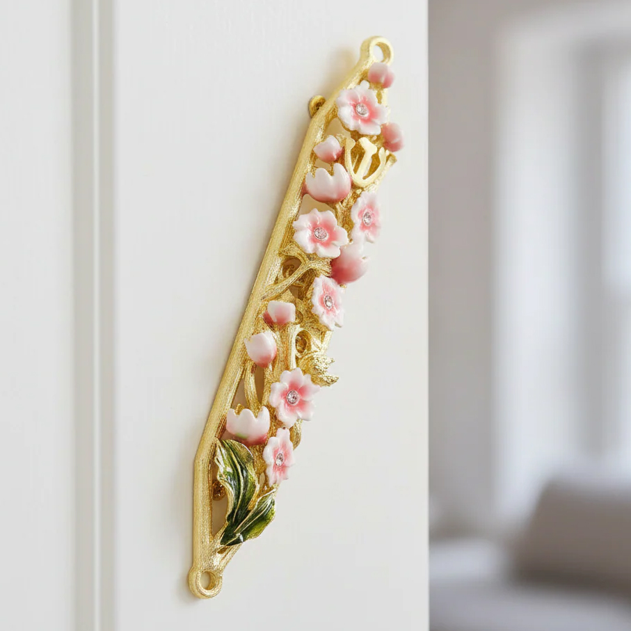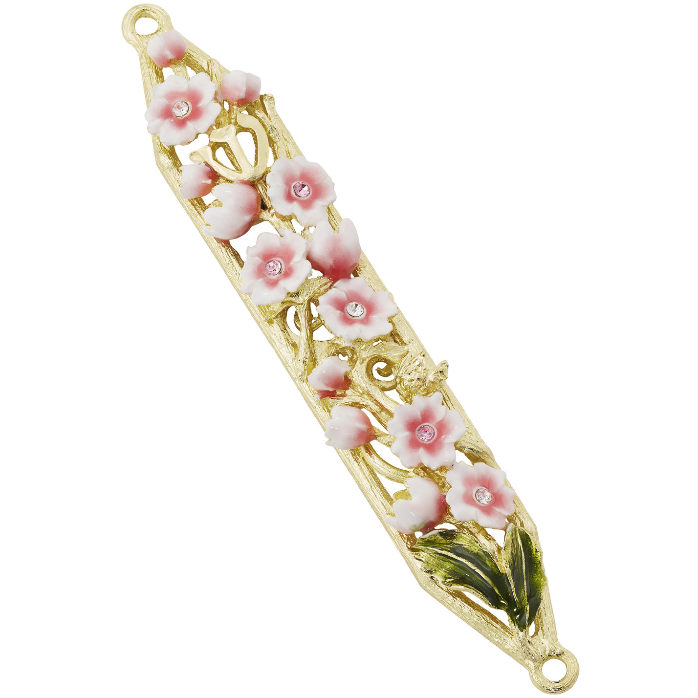Delightful floral pattern mezuzah case in gold finished pewter, with pink & green hued hand-enameling and hand-set European crystals. Tarnish resistant. Signature luxury gift box included.