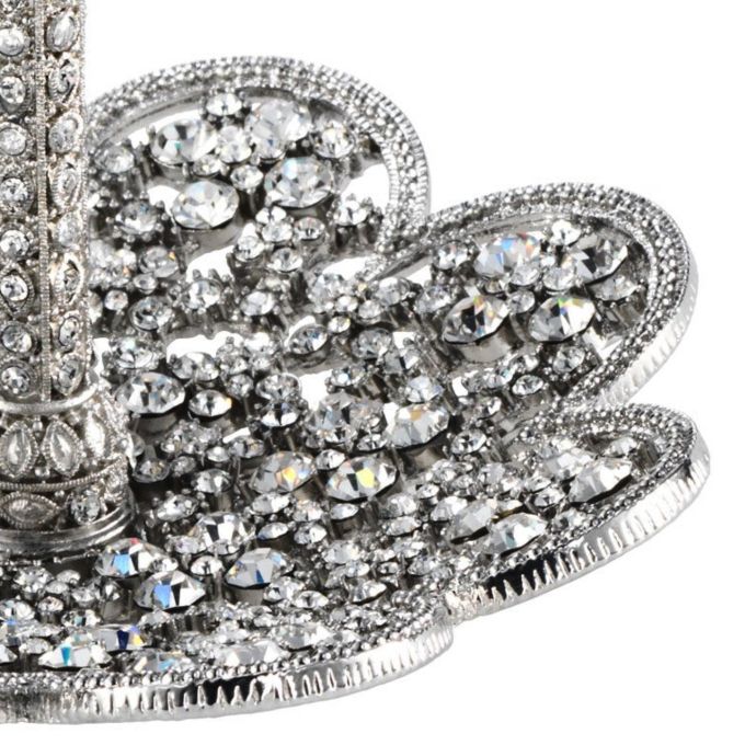 Silver finished pewter ring holder, encrusted with multi-sized clear European crystals and topped with white cat's eye cabochon. Tarnish resistant. Signature luxury gift box included.