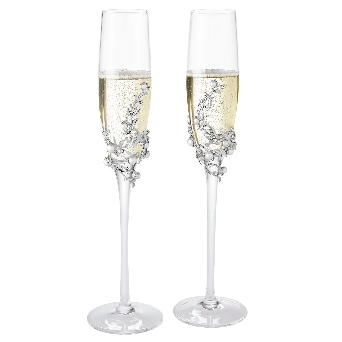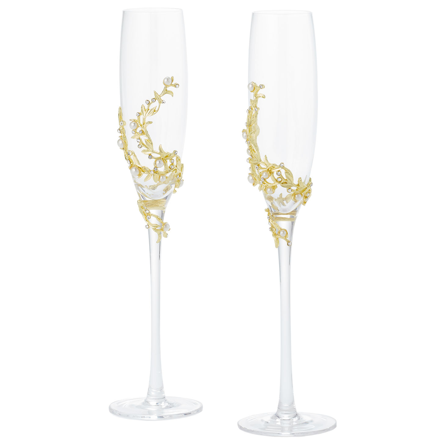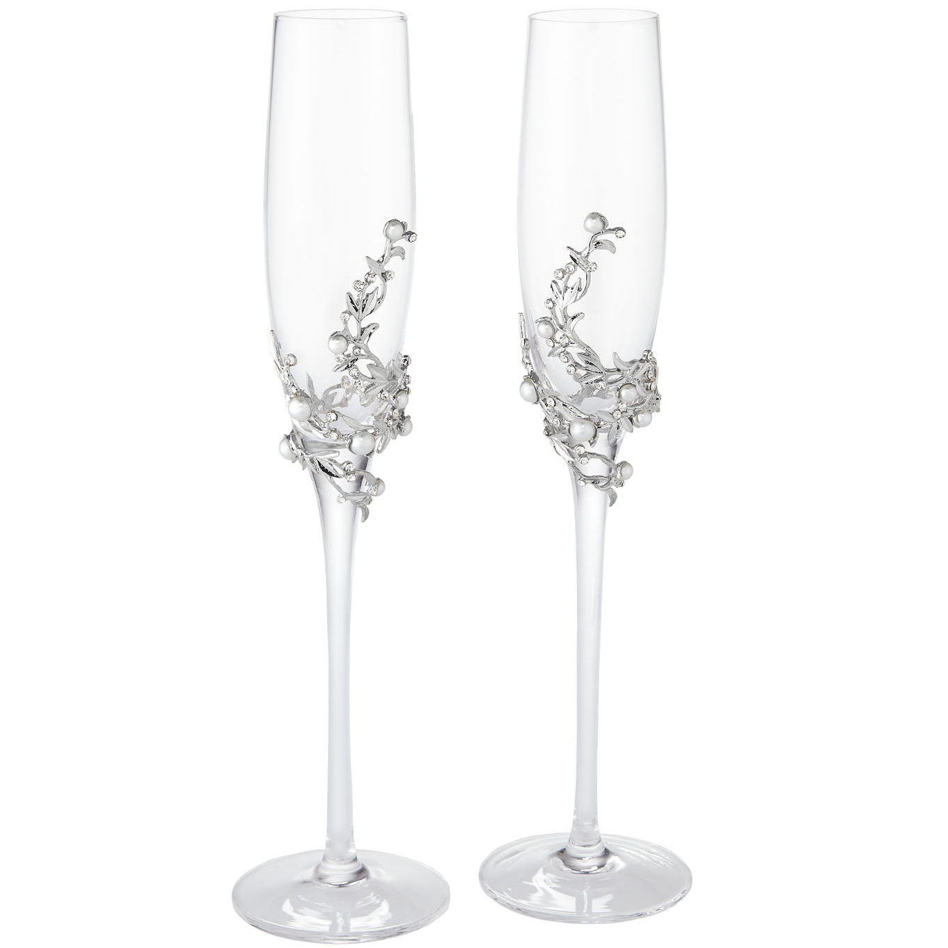 Glass stemmed champagne flutes, wrapped with gold or silver finished pewter adornment. Encrusted with hand-set clear European crystals and faux pearls. Glass can be acid etched. Hand-wash. Signature luxury gift box included.