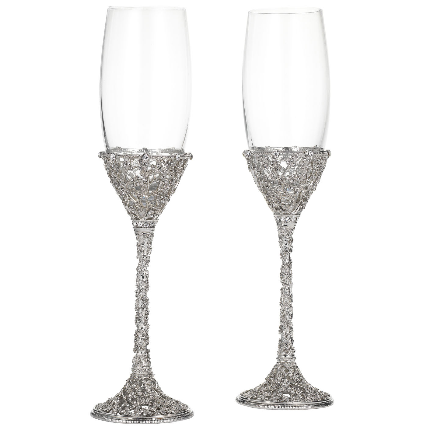 Contemporary intricate silver finished pewter branch patterned stems, adorned with hand-set clear European crystals. Glass can be acid etched. Tarnish resistant. Signature luxury gift box included.