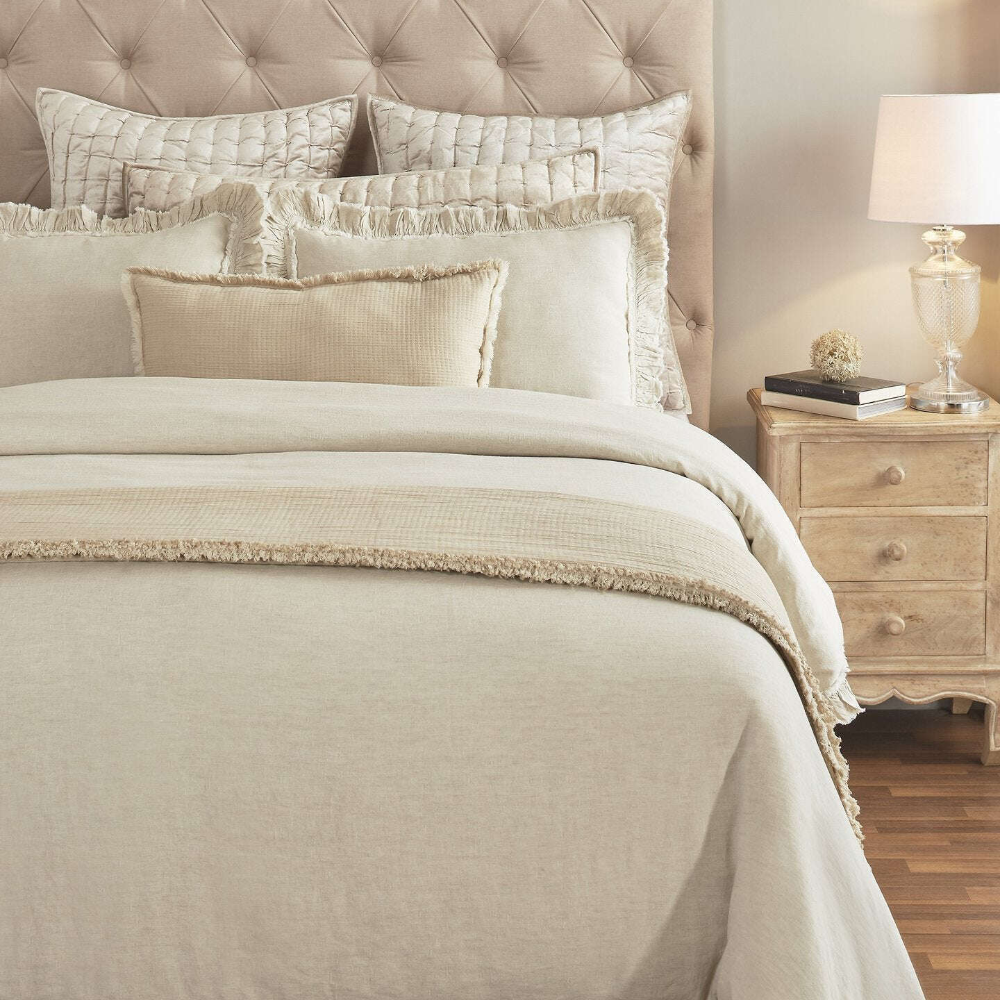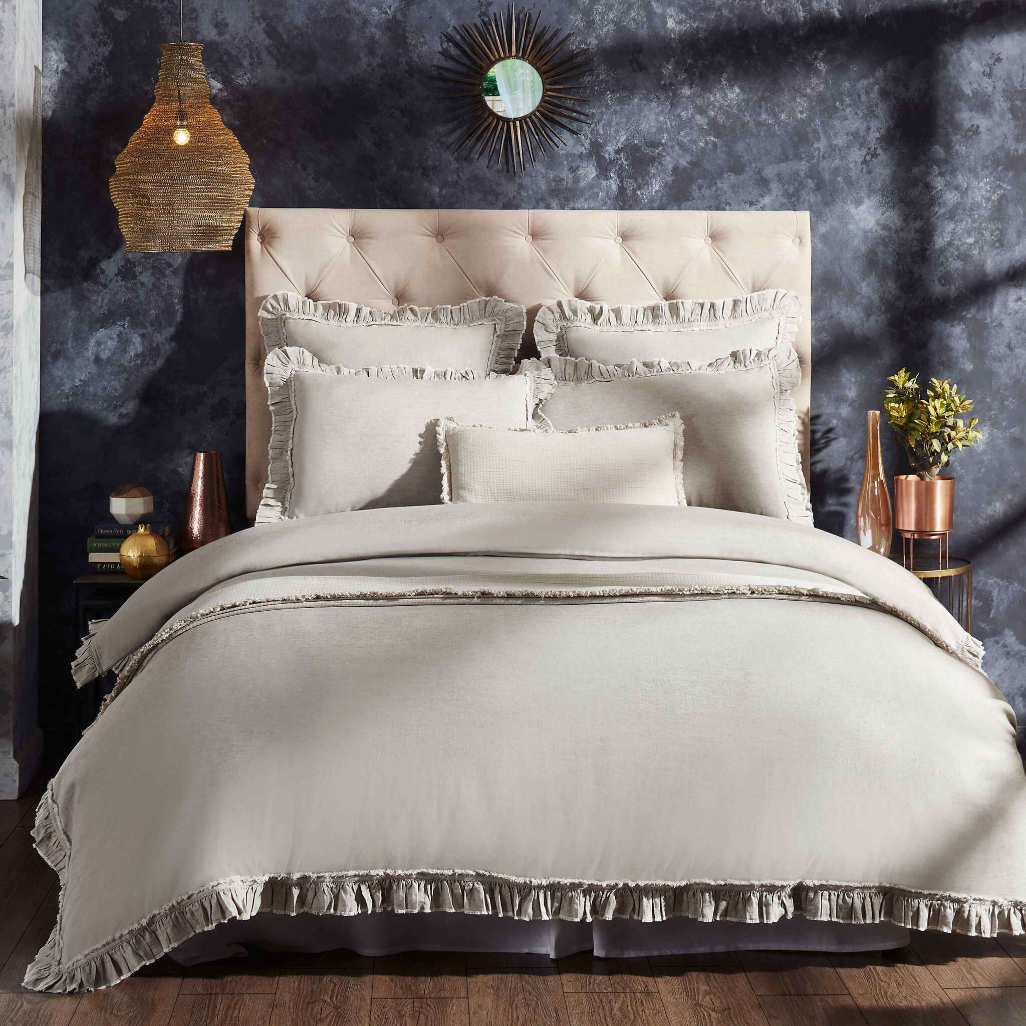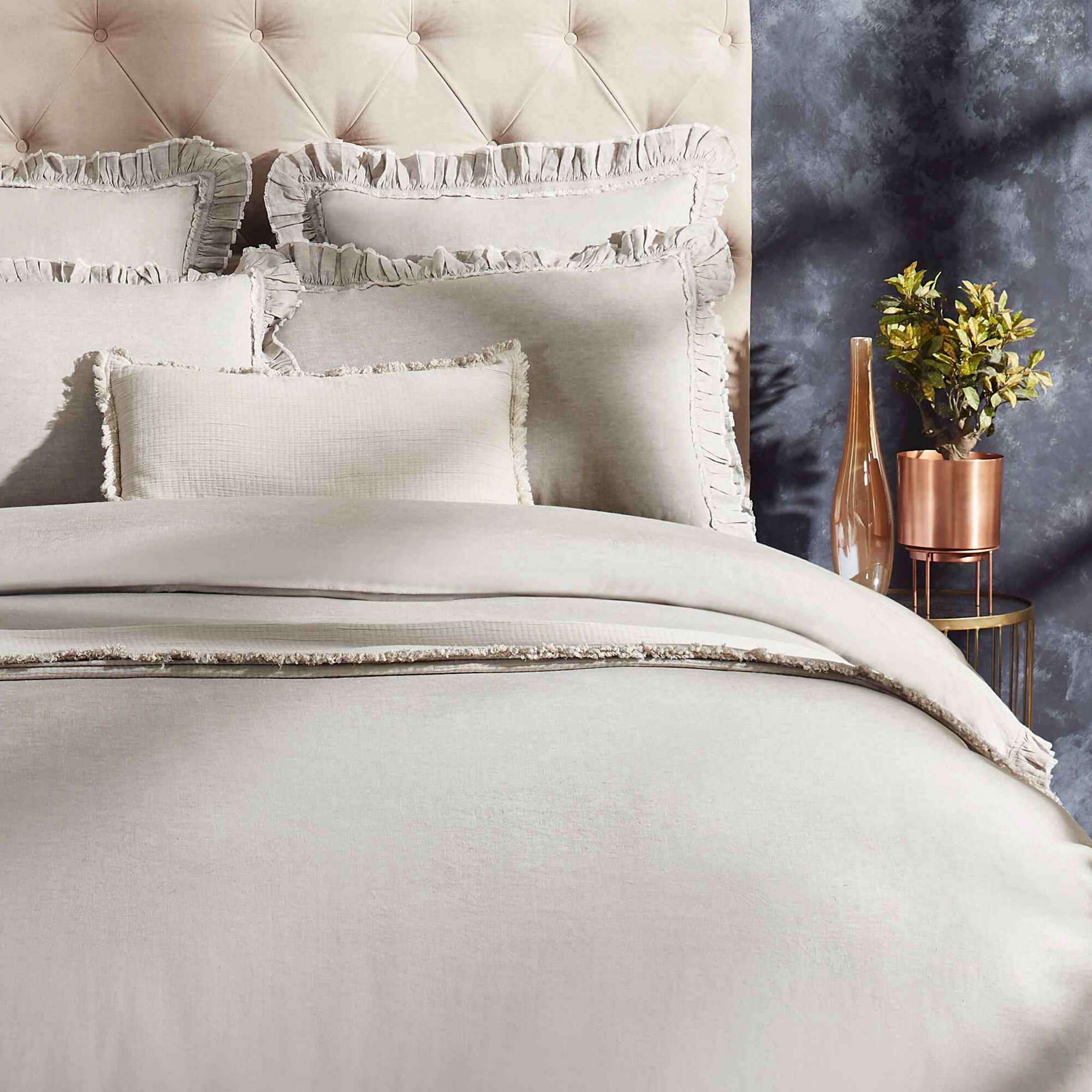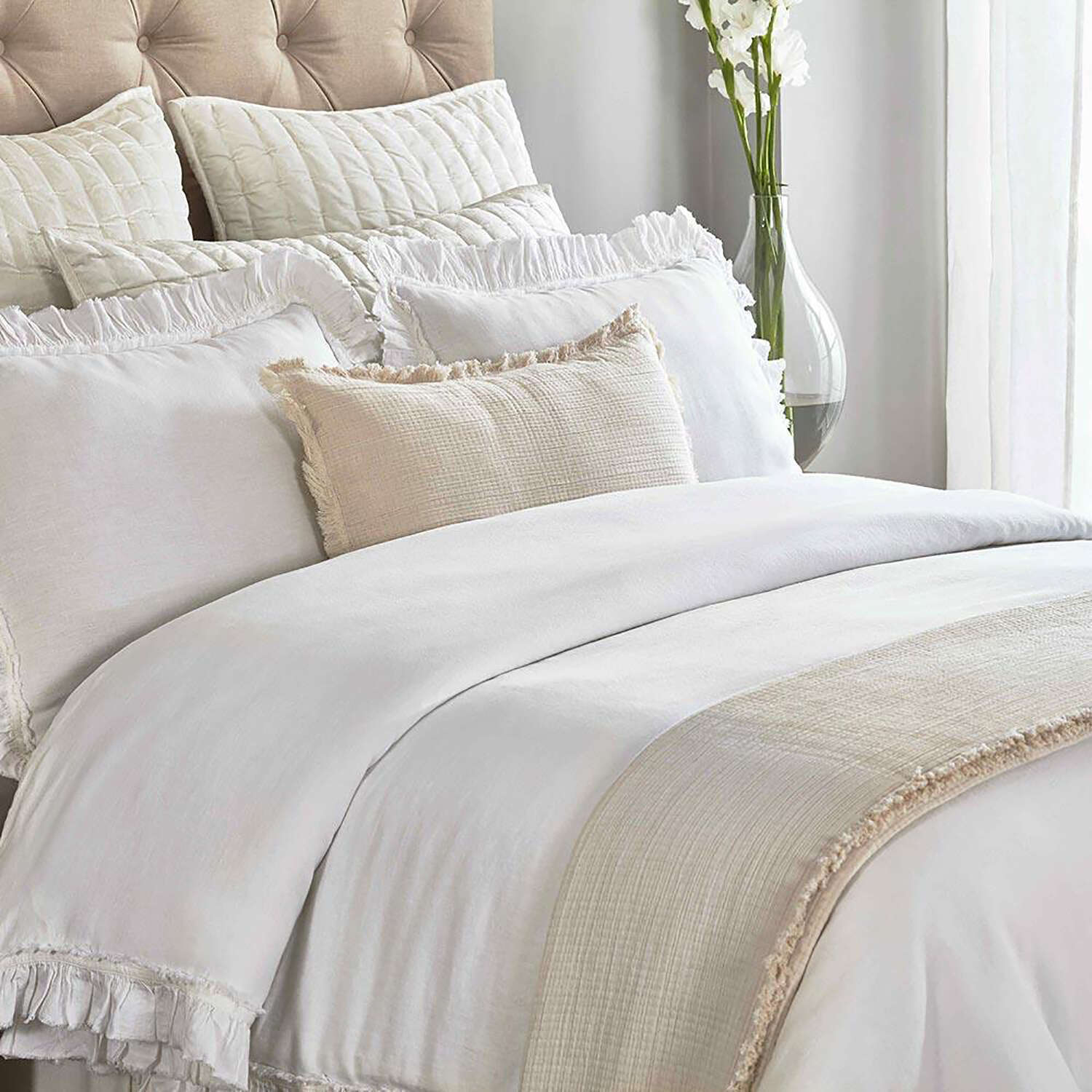 Timeless fabric and gorgeous 2 layers of contrast ruffles give the linen Solana duvet Cover an heirloom quality. Woven from the world's finest Belgian flax, our linen bedding is prewashed for incRedible softness and only gets better with time. Lightly textuRed and cool to the touch, this Natural-fibre fabric is prized for its durability, breathability, and lived-in look.