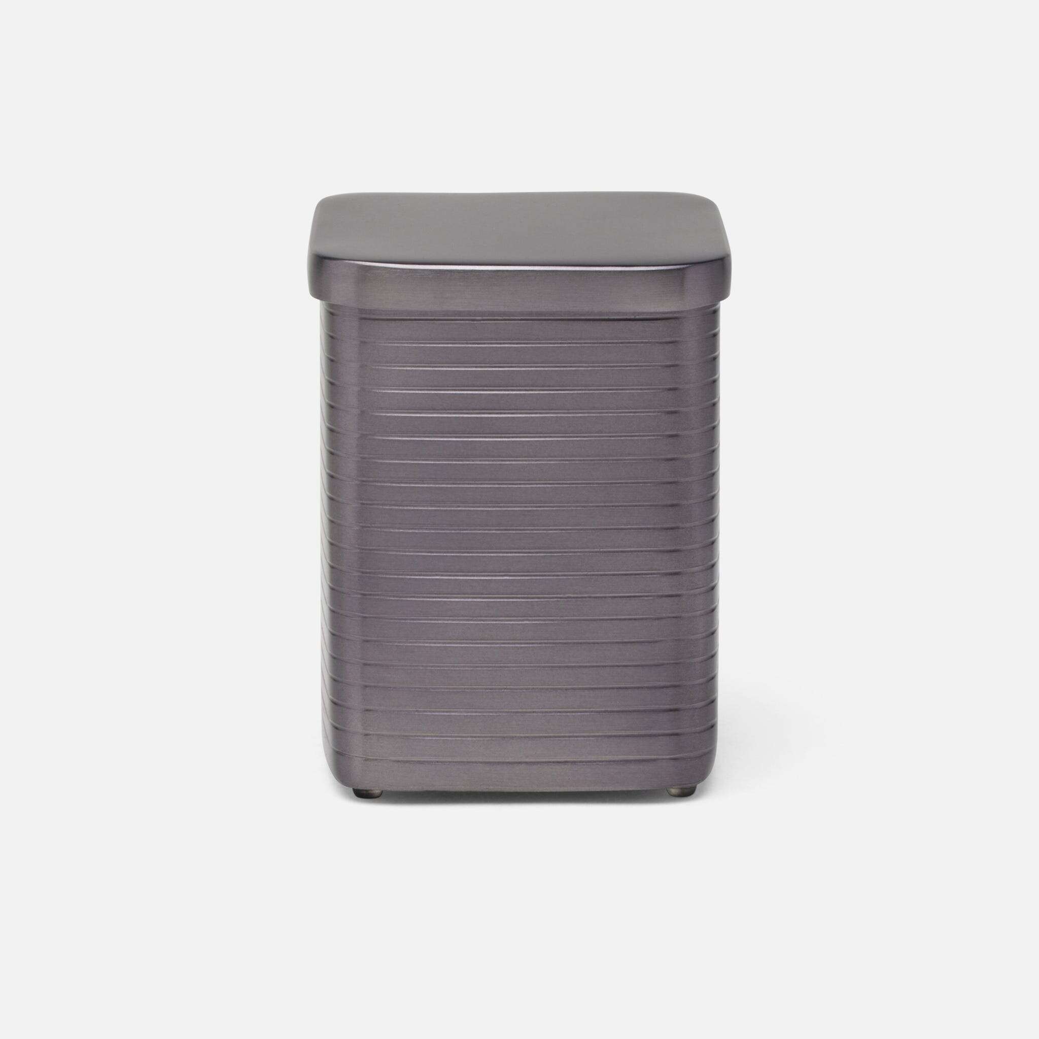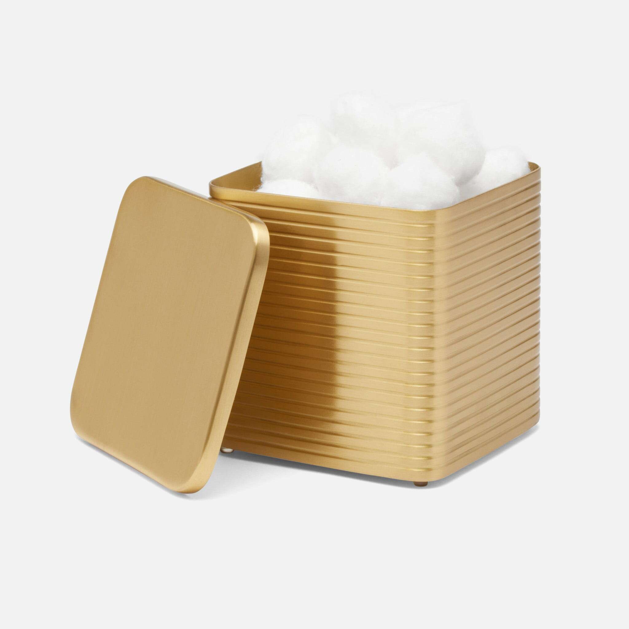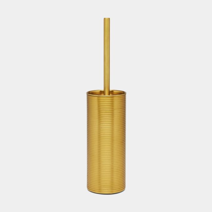 This bath collection's textured stripes—crafted from matte metallics over brass—give the bathroom a clean, polished look. Rounded corners enhance the shine of each piece.