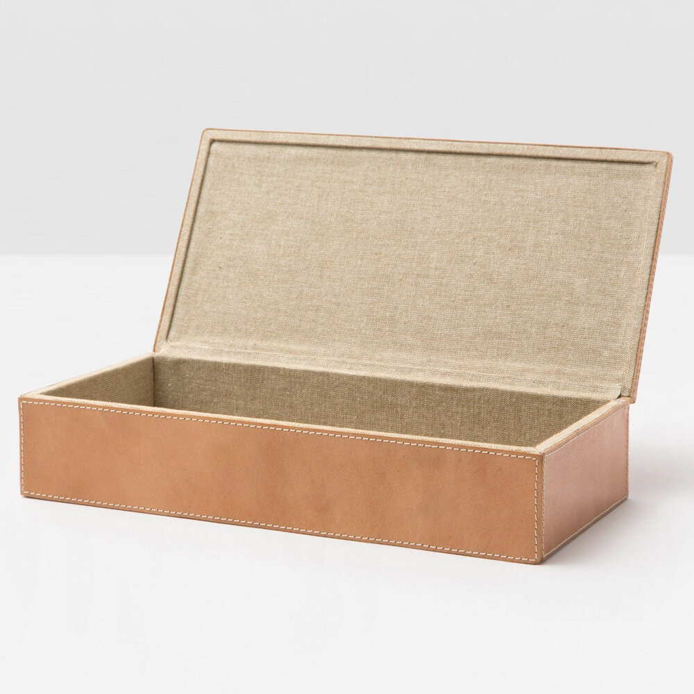 Sophisticated leather boxes with white stitching.