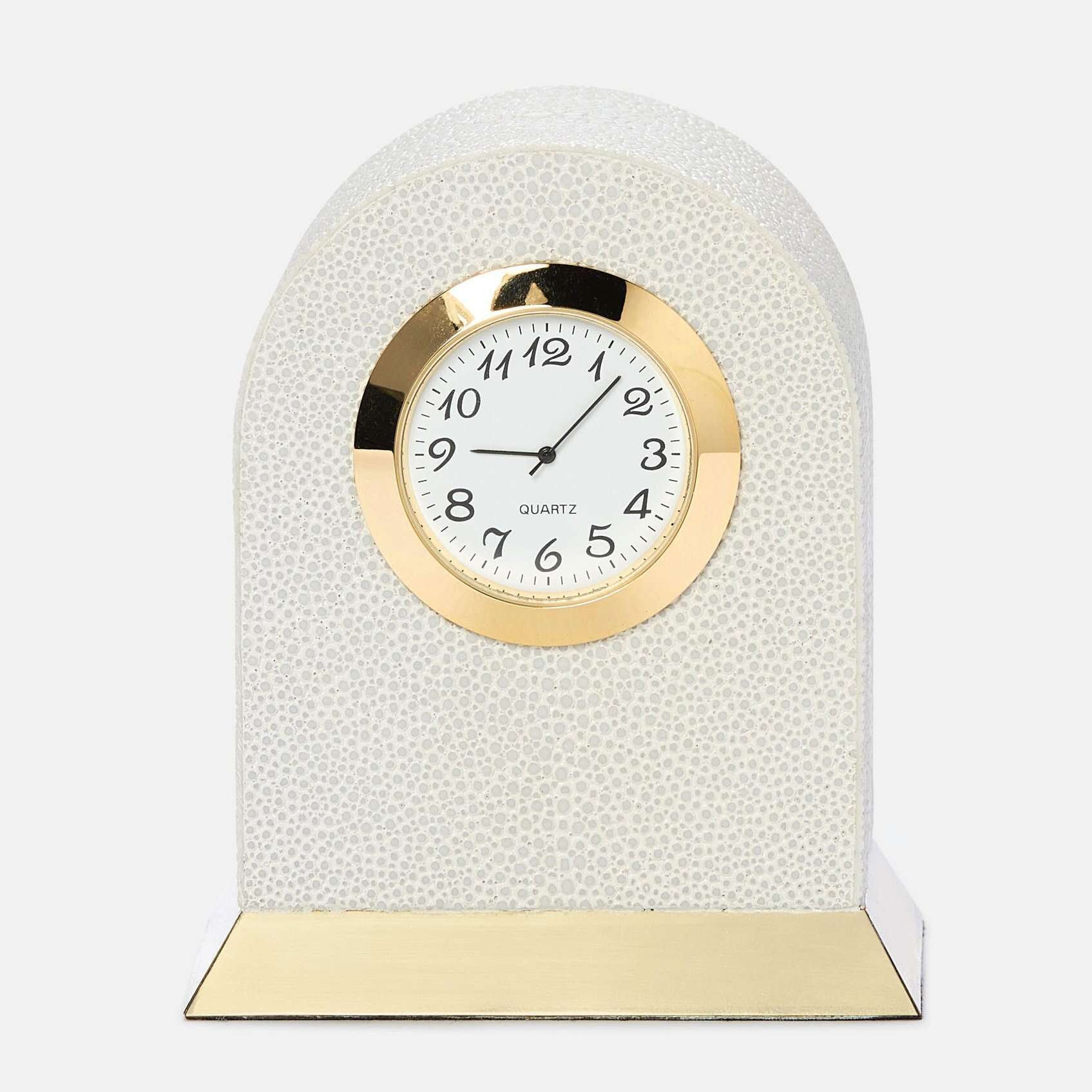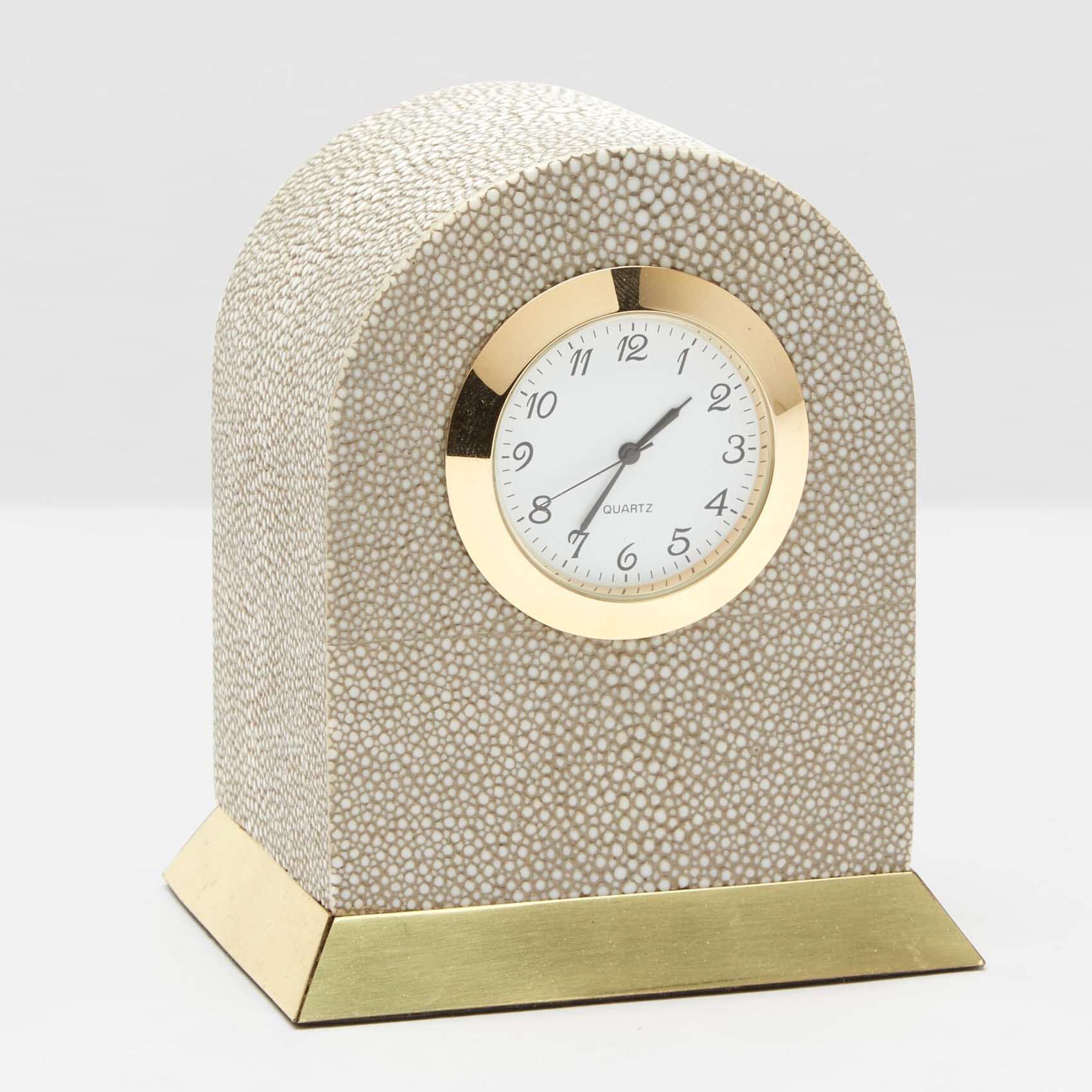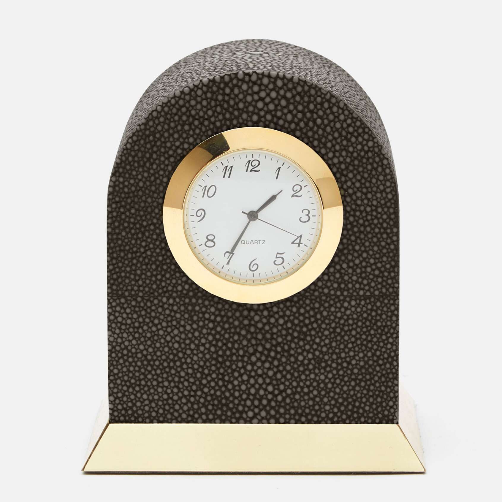 Faux shagreen clock with a feminine silhouette. Beveled brass base.